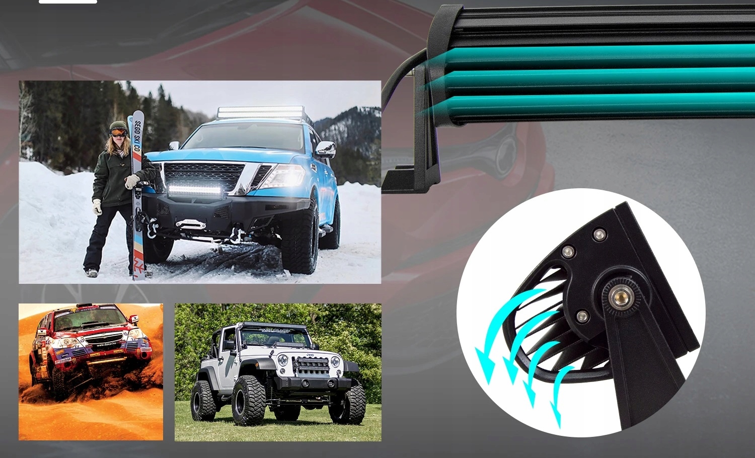 Лампа завдовжки 54 см, що дозволяє легко встановити на різних транспортних засобах, а його міцна конструкція стійка до ударів та вібрацій, характерних для складних польових умов. Корпус лампи є водонепроникним та пилозахисним, що гарантує його надійність та тривале використання навіть у найвибагливіших умовах. Світлодіодна смуга оснащена вдосконаленою системою розсіювання тепла, яка забезпечує тривалий термін експлуатації світлодіодів та стабільність роботи. 4 Ідеальний вибір для водіїв, які шукають ефективного освітлення для позашляхових, сільськогосподарських, рятувальних або будівельних застосувань.