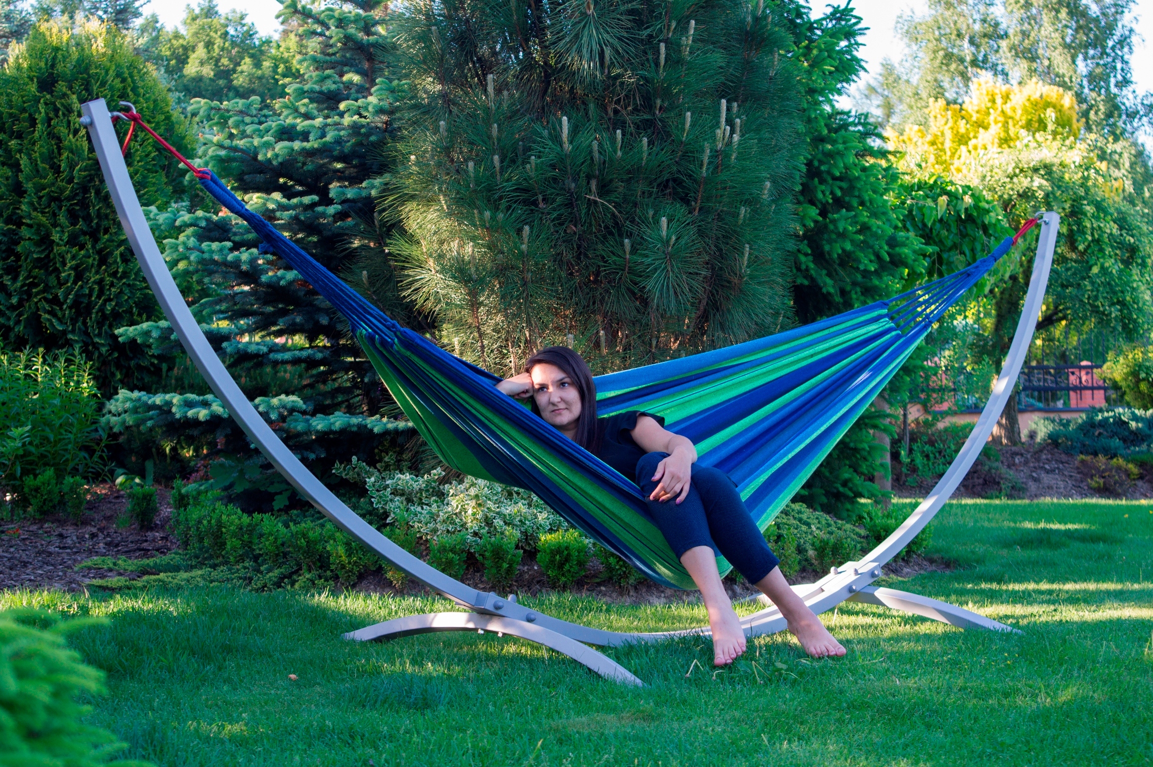 Тканина гамака зі штангою постійно розстелена. Функціонує як шезлонг-гамак. Він ідеально підійде для прийняття сонячних ванн у сонячний день.