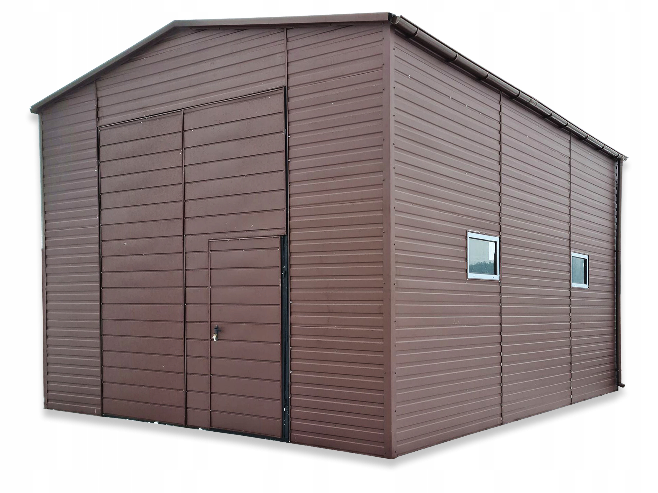 У цій моделі використовуються двостулкові ворота з засувом розміром 390 см у висоту та 300 см в ширину, 4 маленькі вікна, ринви та повні ринви. обробка кузова. Металевий лист тільки одного сорту, розташований горизонтально, такий же, як на воротах, але з широкою панеллю.