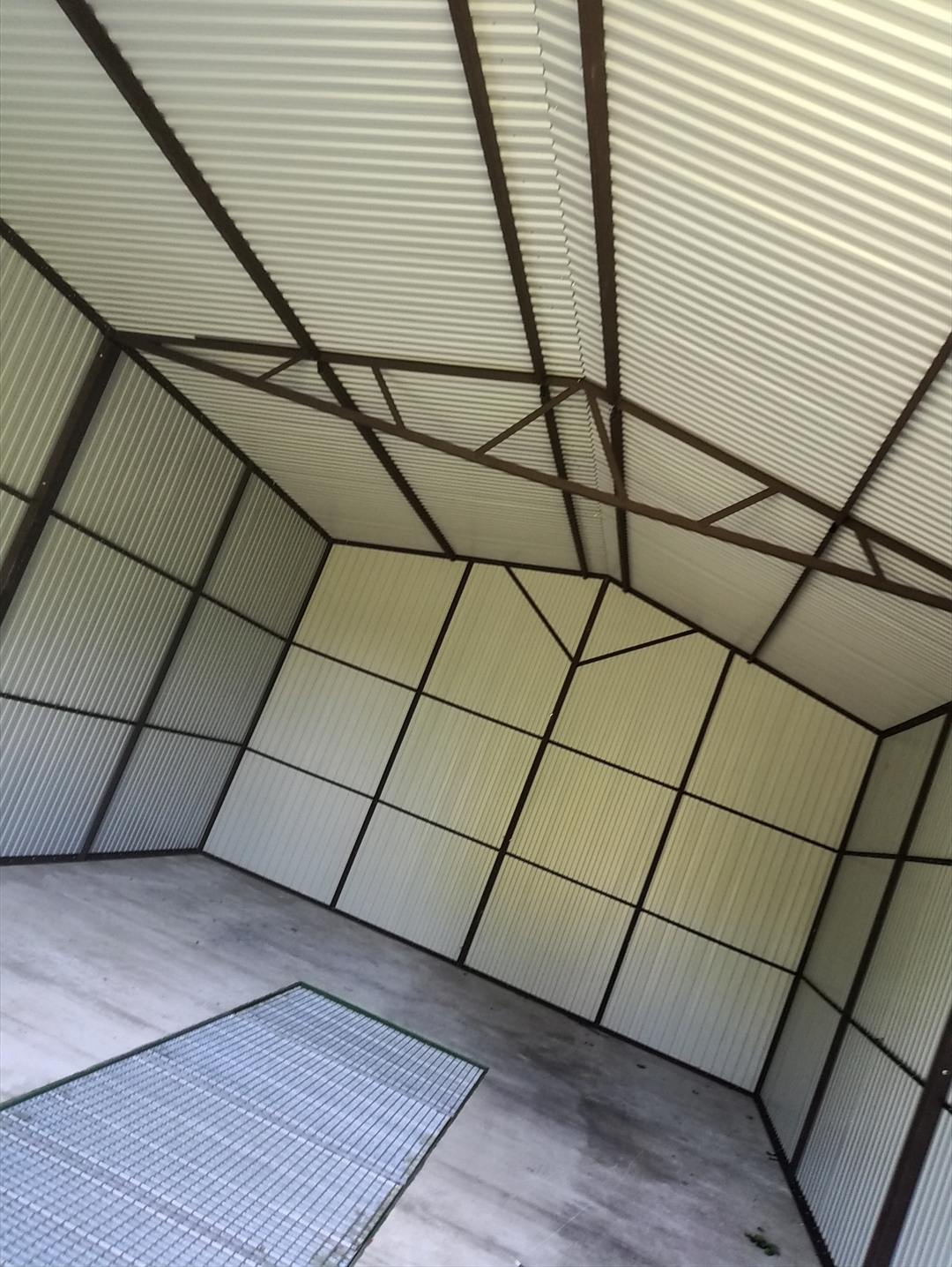 Покрівля виконується із закритих профільних ферм, це означає, що всі навантаження рівномірно розподіляються на конструкції холу та стіни. Для стін використовували також замкнуті профілі, які додатково зміцнювали горизонтальними кріпленнями. Весь гараж з жерсті покритий першим сортом оцинкованого металу. Кожен елемент можна покрити будь-яким кольором із палітри кольорів на аукціоні.
