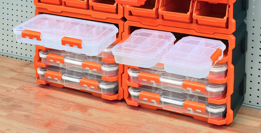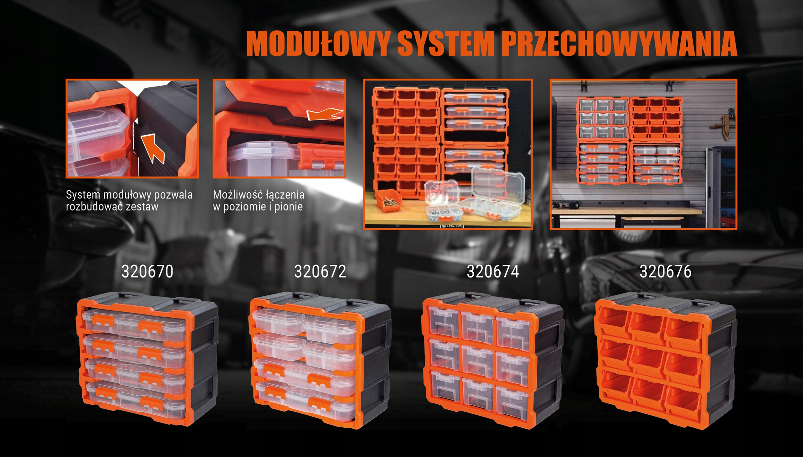 Органайзер був створений для підтримки порядку як у невеликих домашніх, так і у великих професійних майстернях, а також для обмеження перевезення контейнерів лише до потрібних наборів b>. Окремі модулі (кожен містить 4 маленькі та 2 великі закриті контейнери з прозорого пластику) можуть з'єднуватися між собою для створення зручної конфігурації. Все це може стояти на стільниці, але його також можна адаптувати щоб повісити на стіну (за допомогою розширювальних шпильок).
