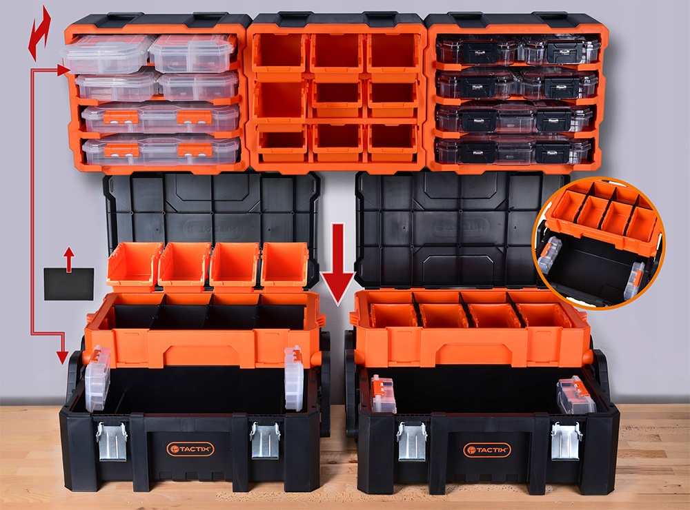 Модулі органайзера можна комбінувати в будь-якій конфігурації. Окремі контейнери з модульного органайзера поміщаються в ящик для інструментів Tactix 320658 або переносний лоток Tactix 320656.