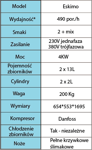 Найкраща дриль у своєму класі. Виготовляє два смаки морозива та їх мікс. Просте обслуговування, гарантія 3 роки, смачне морозиво. Нову серію автоматів ESKIMO особливо оцінять кафе-морозиво, перед якими стоять довгі черги.