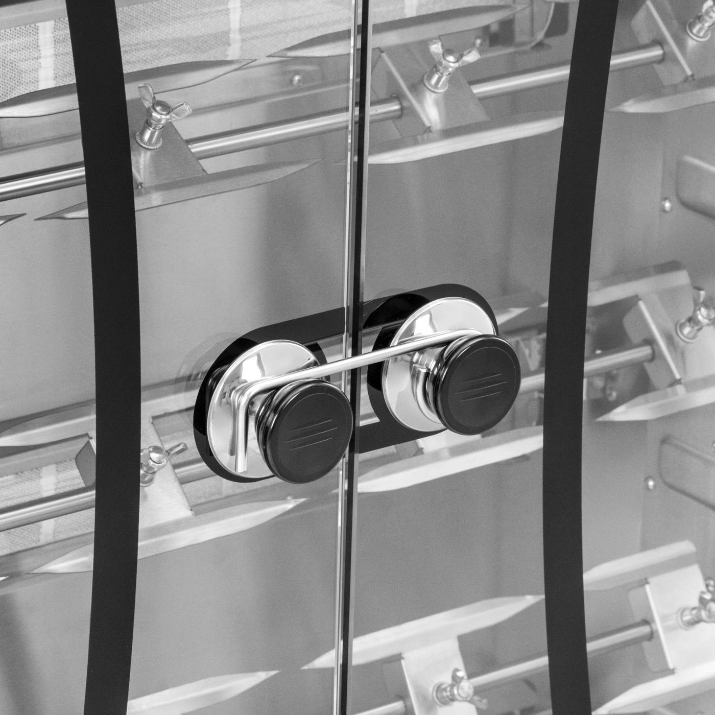 З газовою курячою вертелою від Royal Catering усі будуть ситі! Пропонуйте своїм клієнтам смачну курку, ростбіф, баранячі ніжки, печеню та багато інших свіжоприготованих і хрустких делікатесів. На шести обертових шампурах, на яких можна розмістити 4 курки, ви зможете випікати улюблені страви рівномірно, делікатно та з хрусткою шкіркою. Це можливо завдяки зонам нагріву, які можна вмикати і вимикати незалежно одна від одної, дозволяючи готувати різні страви паралельно. Ви можете легко запустити газовий гриль для курей за допомогою п'єзоелектричного підпалу. Пристрій на заводі адаптовано до газу I3B/P(50), але завдяки насадкам, що входять до комплекту, ви також можете використовувати природний або зріджений газ.