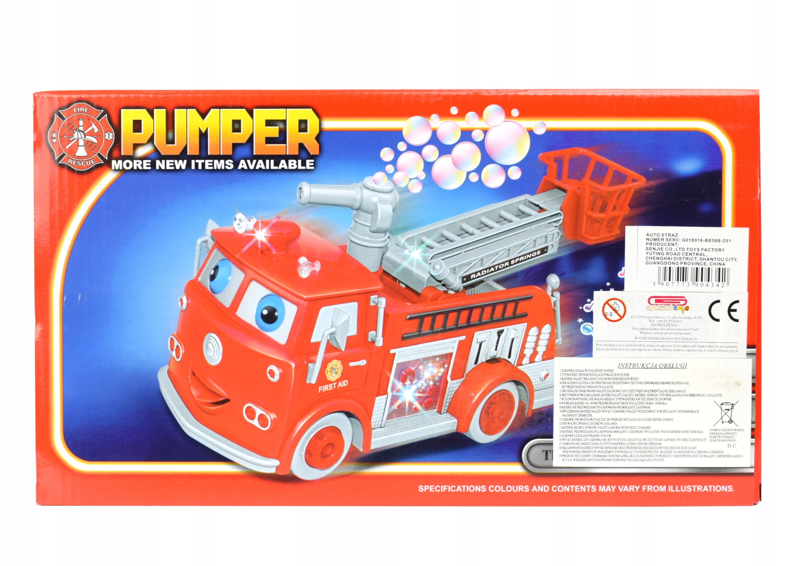 Машина видає звуки характерні для пожежної сирени, блимає червоним і синім світлом. Він піднімає і висуває драбину, підсвічуючи її зеленим, і повертає водяну ракету на 45° вліво і вправо. Коли автомобіль натикається на перешкоду, він самостійно змінює напрямок. Крім того, він крутить колеса та кошик, а головне, рухає очима в сторони та висуває язика.