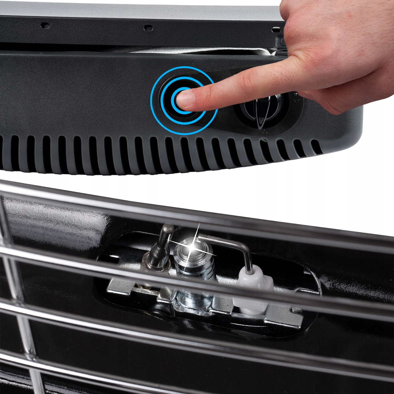 Піч оснащена спеціальним п'єзоелектричним розпалом. Це означає, що при натисканні на спеціальну червону кнопку на маленькій панелі управління створюється електрична іскра. Одночасне натискання кнопки газової арматури включає опалення. Завдяки цьому пристрій не потребує електрики. Ви можете розмістити їх де завгодно, незалежно від розташування розеток.