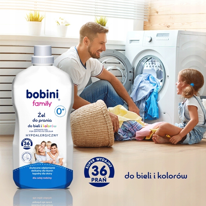 Гель для прання Bobini b> b>Family ефективно дбає про одяг усієї родини, призначений для щоденного прання. Регулярне використання сприяє розгладженню волокон бавовняних тканин.