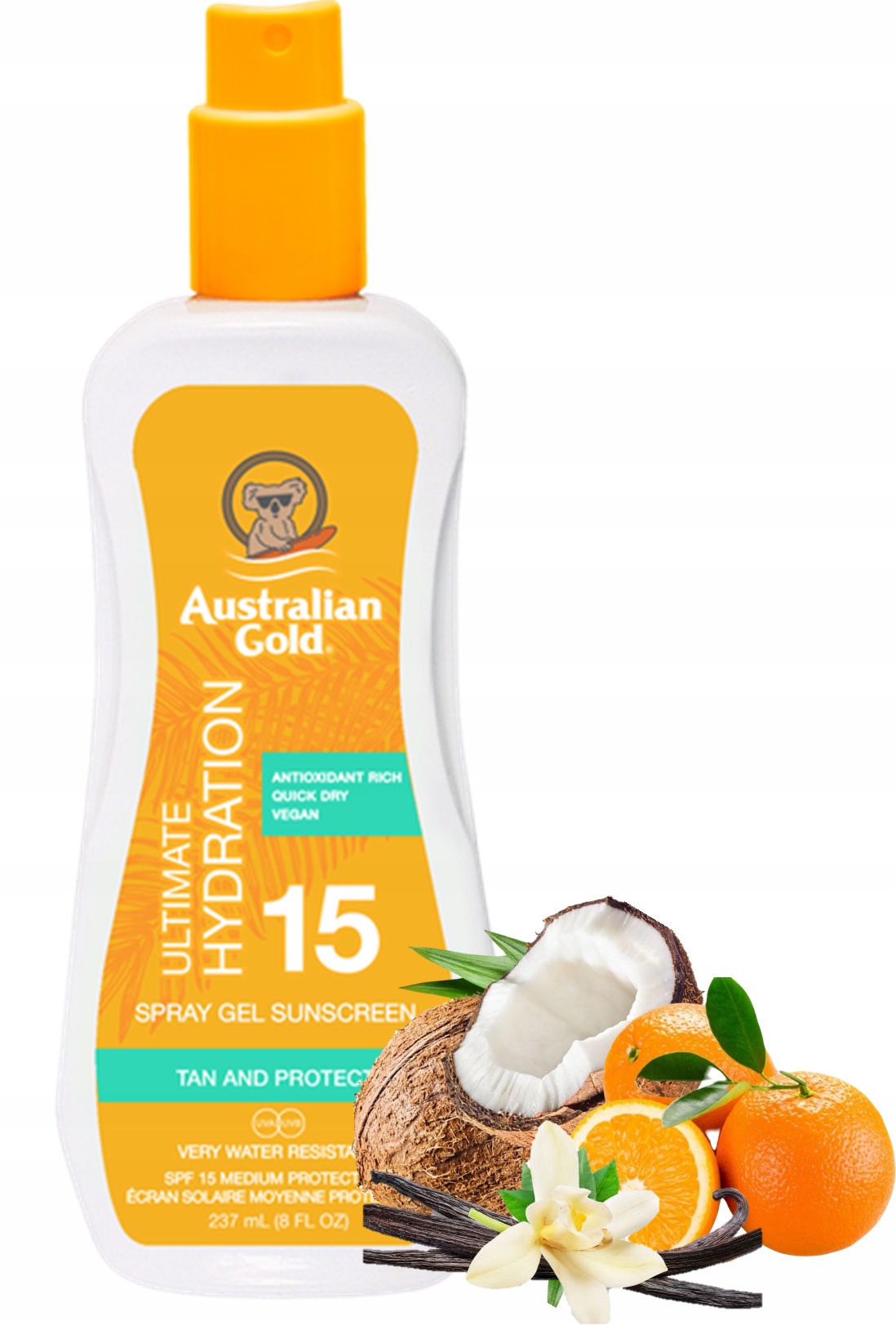 Australian Gold Gel SPF 15 БЕЗ БРОНЗАТОРА в спрей, він чудово захищає від UVA та UVB випромінювання та неймовірно швидко вбирається. Містить, серед іншого: алое, вітамін Е, олія австралійського чайного дерева та екстракти насіння соняшнику не тільки добре захищають шкіру, але й забезпечують їй чудовий догляд.