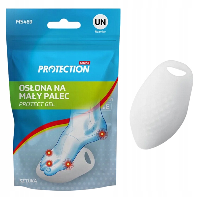 Protect Gel Cover чудово підтримує вальгусну форму мізинця. Ефективно захищає від мозолів і натоптишів, а також підвищує комфорт при ходьбі у взутті. Модель виготовлена з м'якого гелю, який безпечний для шкіри та добре адаптується до форми стопи. Спеціальне кріплення (петля) на мізинці утримує кришку в потрібному місці і не дає їй рухатися. Це продукт багаторазового використання, і для підтримки належної гігієни просто вимийте його водою з милом, а потім висушіть при кімнатній температурі. Чохол Protect Gel доступний в одному універсальному розмірі і може використовуватися як жінками, так і чоловіками.