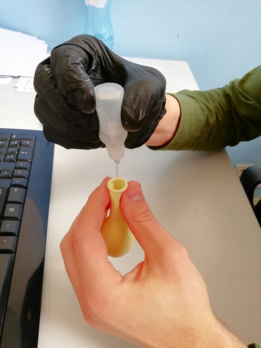 - Потім розподіліть гель у повітряній кульці, масажуючи всі його стінки. Якщо ви не відчуваєте ковзання, можете додати ще трохи гелю. І в цьому випадку ми опускаємо шийку повітряної кульки, оскільки вона зісковзне під час зав’язування, і це може завадити зав’язуванню вузла або спричинити неправильну роботу гелю.