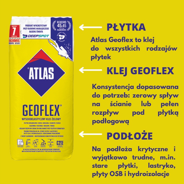 Високоеластичний гелевий клей ATLAS GEOFLEX виготовляється у вигляді сухої суміші цементного в’яжучого найвищої якості, заповнювачів і спеціально підібраних модифікаторів: натуральних і синтетичних.