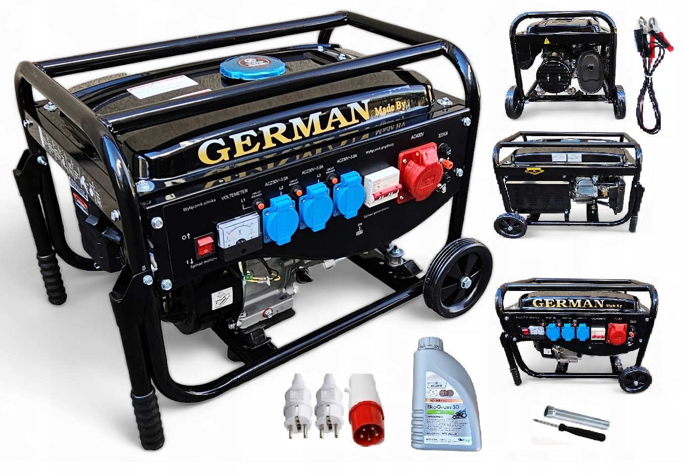 Генератори GERMAN Polska характеризуються надійністю, неперевершеними параметрами та оснащені багатьма системами, які гарантують найкращі параметри потужності та якість електроенергії, зберігаючи при цьому мінімально можливе згоряння. За це відповідає статор, який використовує додаткову схему, яка вирівнює потужність і напругу між фазами, і інтелектуальний дросель, який працює автоматично і підтримує постійну швидкість незалежно від навантаження. Агрегат додатково оснащений вимикачем напруги 230/400В.