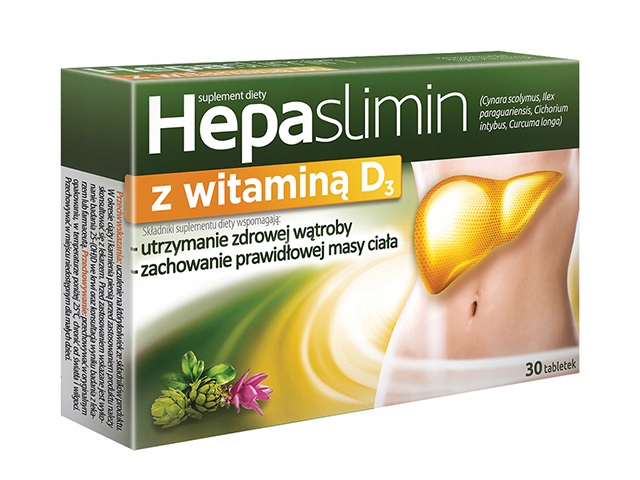 Гепаслімін з вітаміном D3 - це дієтична добавка, що містить вітамін D3, який сприяє належному функціонуванню імунної системи, також містить холін, який є природним інгредієнтом в організмі; він входить до складу фосфоліпідів, які будують клітинну мембрану кожної живої клітини. Екстракт листя артишоку, що міститься в препараті, сприяє правильній роботі шлунково-кишкового тракту і підтримує здоров'я печінки. Екстракт кореня цикорію підтримує травлення та допомагає підтримувати здорову печінку. Екстракт індички підтримує правильний ліпідний обмін і підтримує жировий обмін у печінці. Екстракт листя святого підтримує процес розщеплення ліпідів і допомагає підтримувати нормальну масу тіла.