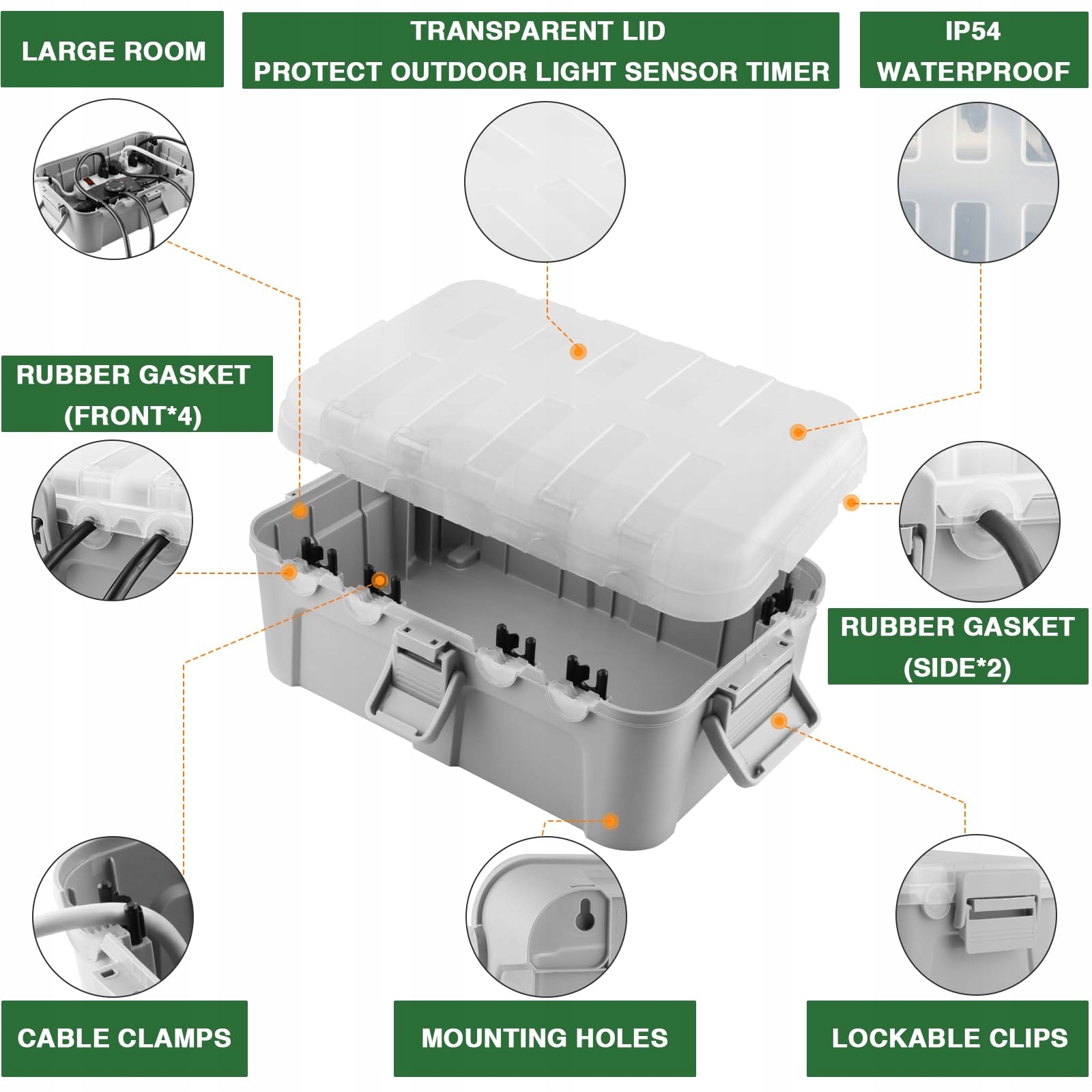 Захисна скринька буде працювати як в комерційному, так і в професійному використанні. Його можна використовувати для садівництва, ставків, садового освітлення або басейнів. Підходить для внутрішнього та зовнішнього використання. Він може легко вмістити різні типи кабелів, перемикачів часу, смужки живлення та радіоприймачів.