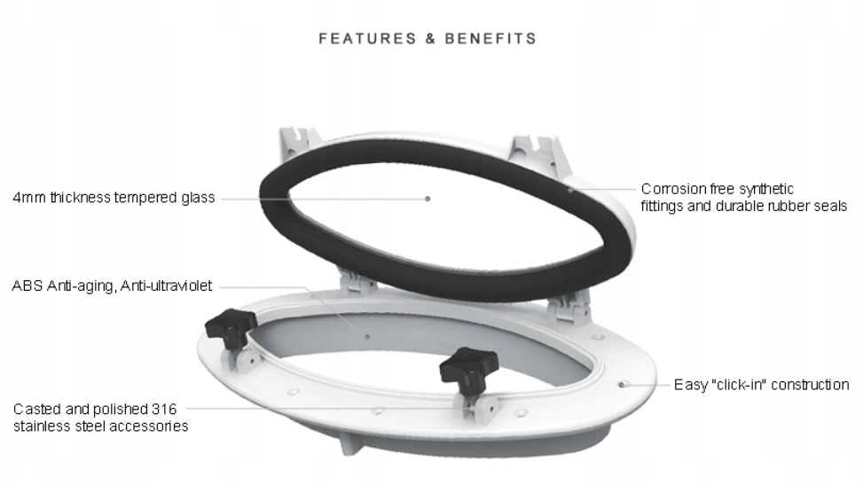 ГЕРМЕТИЧНИЙ ВІКОННИЙ ІЛЮМАНТ - ЕЛІПТИЧНИЙ 410 X 220 мм -Високоякісний, герметичний яхтовий ілюмінатор, стійкий до ультрафіолетового випромінювання, виготовлений з термопластику ABS з твердим армуванням. Ілюмінатор також ідеально підходить для каравану або кемпера.