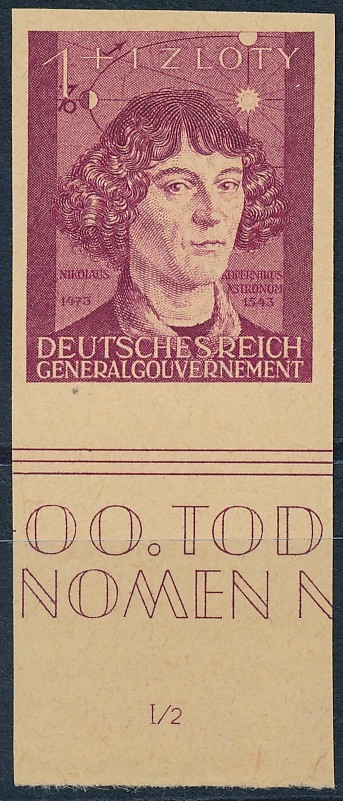 Загальний уряд 1943 р. Ніколаус Коперник 1 + 1 Zloty non -перекладений тест, надрукований на жовтуваному папері без друку з позначенням сектору "I / 2" !!!