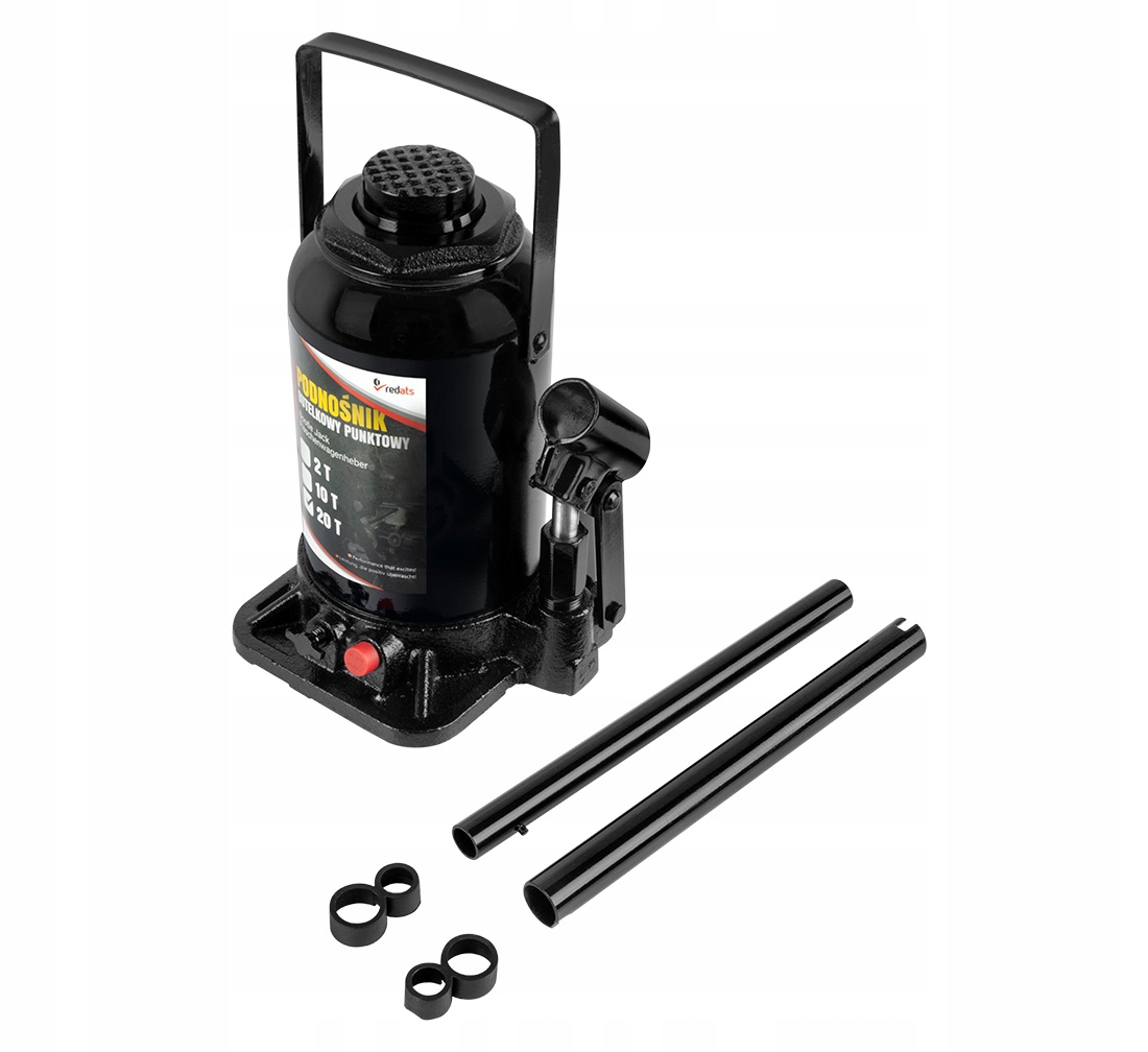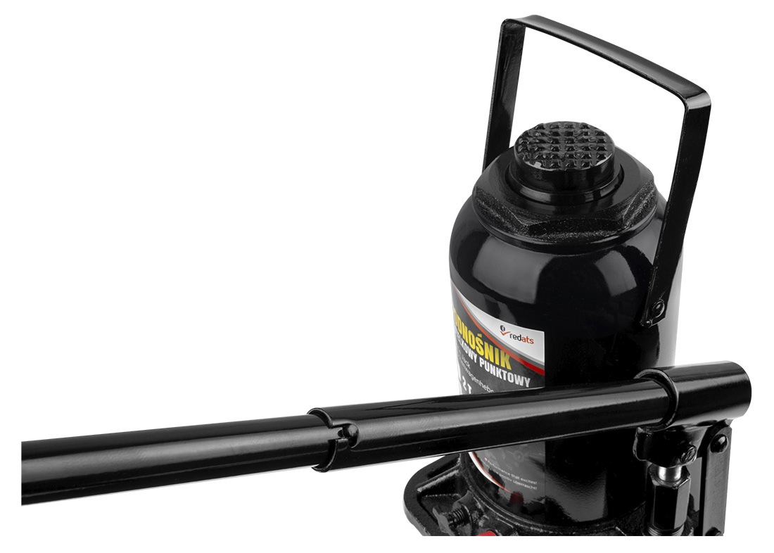 Пляшковий домкрат оснащений ручкою з двох частин - складний елемент значно полегшує роботу під час підйому автомобілів.
