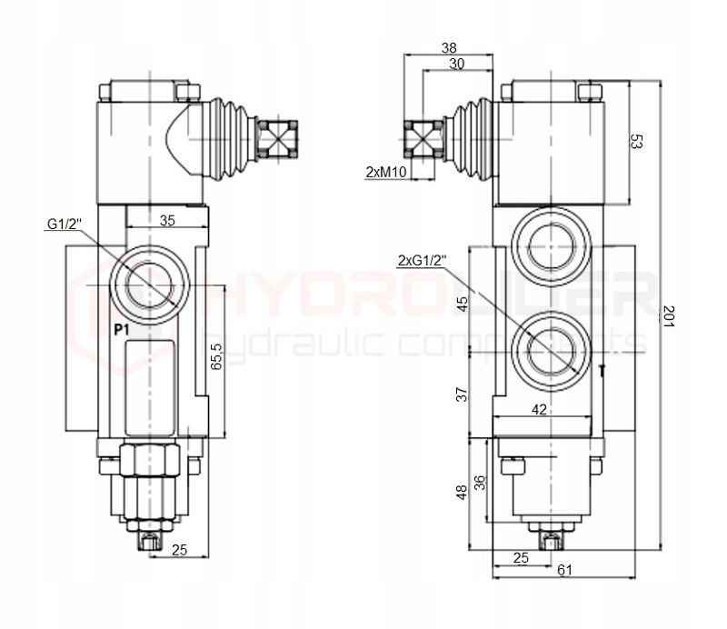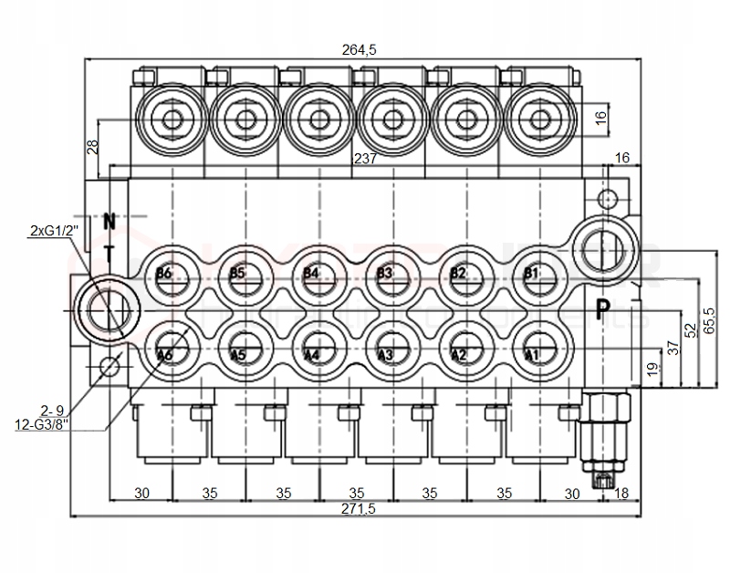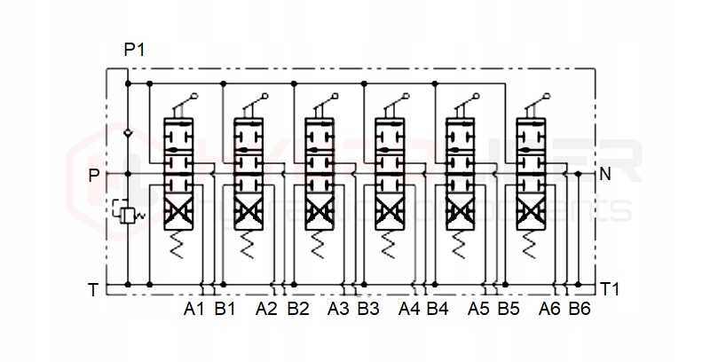Пристосований для керування одно- або двостороннім циліндром. Він має вихід тиску N, необхідний для послідовних з’єднань або для встановлення розподільника як іншого в існуючій системі.