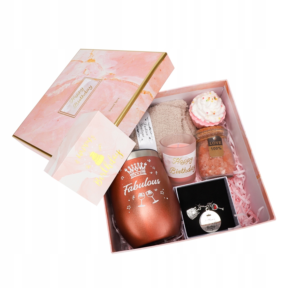 Подарунковий набір для жінок на день народження включає 1 360 мл ізольовану чашку для вина/кави (з соломинкою з нержавіючої сталі та очисником), 1 бомбочку для ванни ручної роботи, 1 ароматичну свічку, 1 пляшку солі для ванн, 1 пару м’яких пухнастих шкарпеток, 1 брелок на день народження, 1 вітальну листівку та 1 вишукана подарункова коробка з днем народження. Кожен подарунок протягом багатьох років досліджувався та відбирався експертами, які спеціалізуються на подарунках на день народження для жінок.