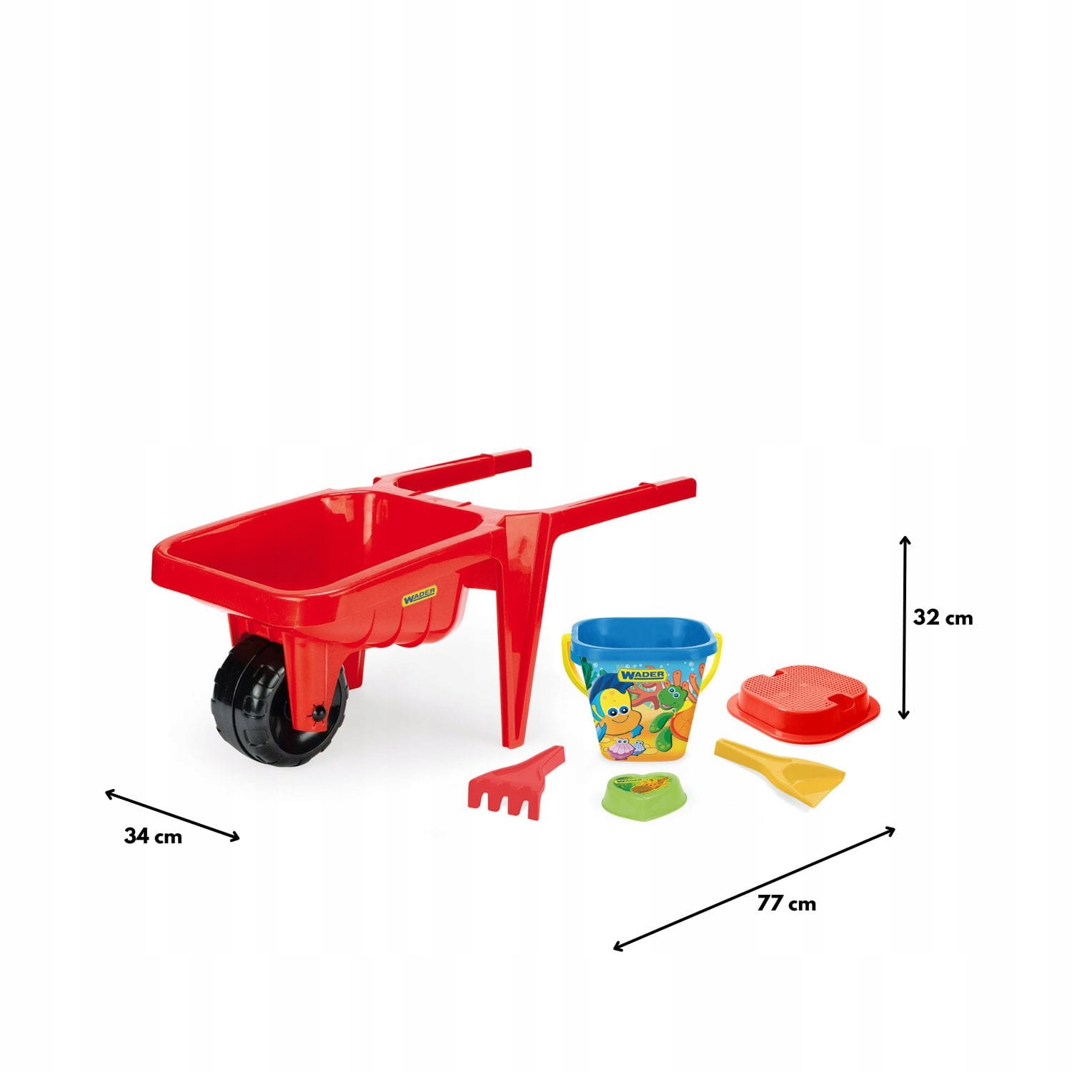 Червона гігантська тачка ідеально підходить для гри як на пляжі, так і в саду чи вдома. Його можна використовувати для транспортування піску, блоків або інших предметів (вантажопідйомність до 100 кг). Літній набір, що містить відро, цвіль, ситечко, обійми та лопатка, було прикріплено до тачки. На відрі є барвиста графіка, виготовлена за методом IML (вбудована безпосередньо в матеріал, завдяки якому він стійкий до води та сонця). Гра з тачками та іграшками з піском підтримує фізичну активність дітей, покращує їх координацію та ефективність руху та вчить співпраці в групі. Ціле виробляється в Польщі з безпечних та довговічних матеріалів.