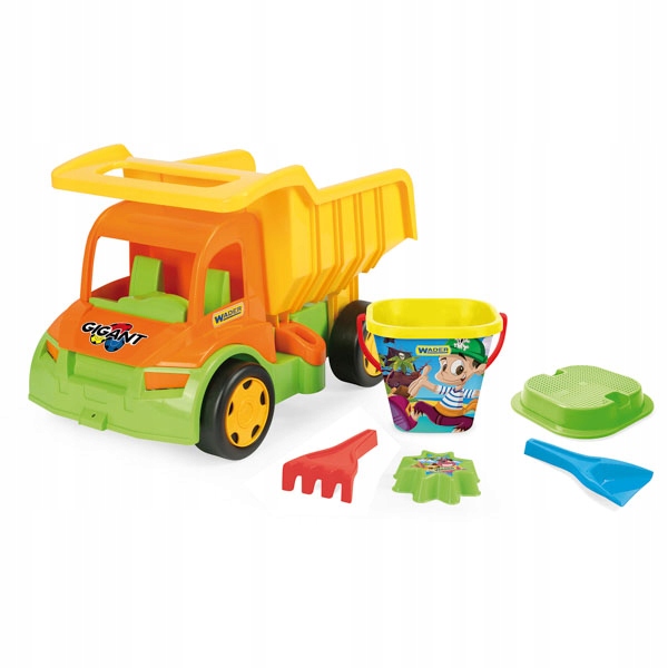 Вантажівка Giant Truck Dump Truck з набором для піску - це фантастична, велика машина, довжиною 55 см, теплих, літніх кольорів, з обладнанням для ігор у піску та воді, яке включає: відро, лопату, граблі, ситечко та форму. Самоскид має самоскид, що відкривається, зі зручною ручкою, на якій дитина може перевозити все, що забажає. Дітям сподобається можливість вантажити, розвантажувати та перевозити різні предмети. Великою перевагою іграшки є міцна і міцна конструкція з вантажопідйомністю до 150 кг. Зчіпка ззаду дозволяє прикріпити причіп серії Gigant до самоскида. Крім того, завдяки великим колесам і стійкій конструкціїGigant Truck Dump Truck також може забезпечити чудову підтримку під час навчання ходьби - дитина може спиратися на іграшку, безпечно роблячи свої перші кроки.