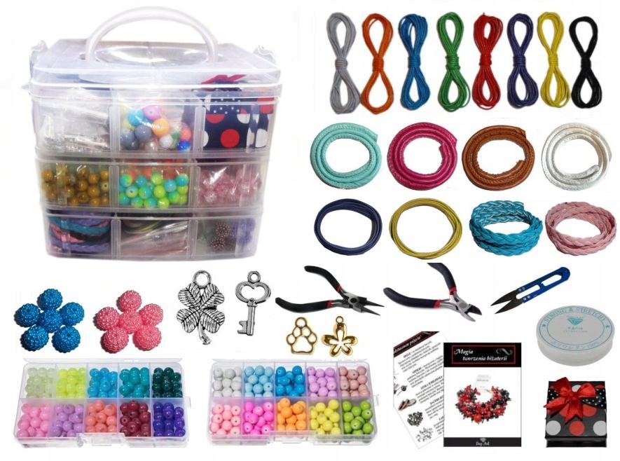 Все сортується в триповерховий багажник і два додаткових органайзера. У набір також входять лелека та кусачки для біжутерії, ріжучий інструмент, дві гумки на рулоні, додаткові мініконтейнери, декоративна коробка та міні-посібник «Магія створення прикрас.