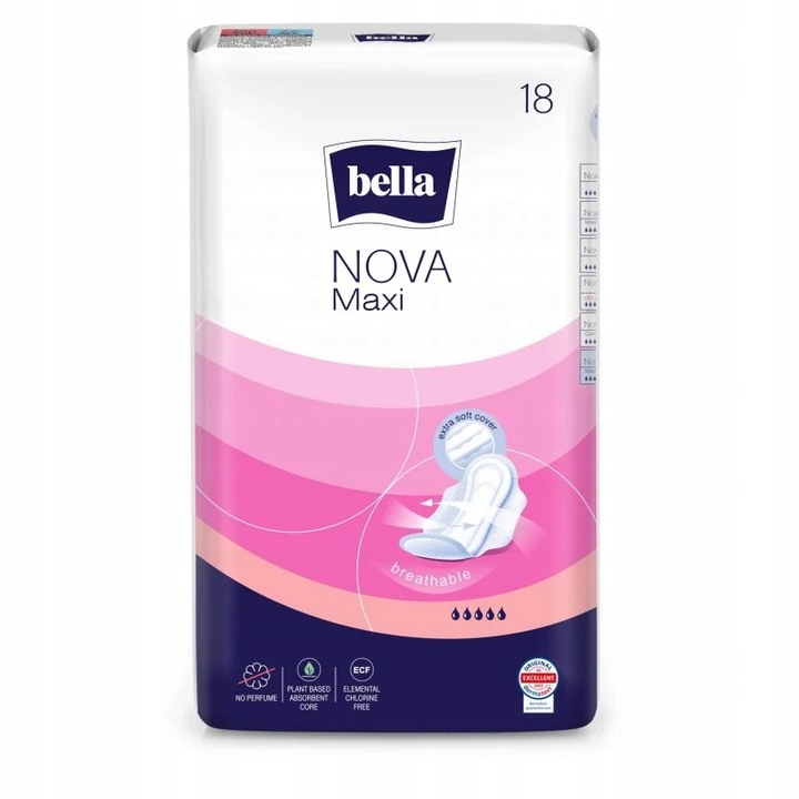 Гігієнічні прокладки Bella Nova Maxiце продукт, розроблений відповідно до потреб жінок, які цінують традиційний, перевірений захист під час менструації. Вони покриті м'яким, приємним на дотик флізеліном, який захищає від подразнення шкіри.
