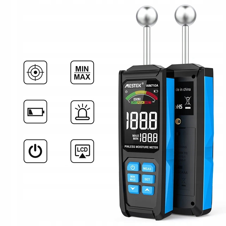 🌟 🌟 застосовується для перевірки вмісту вологи з дерев’яних та будівельних матеріалів, таких як настінні пластини, шифер, плитка, картон, штукатурка, бетон та розчин, а також для ремонту витоків води, перевірки вологи стіни спальні, підлоги або караванів тощо