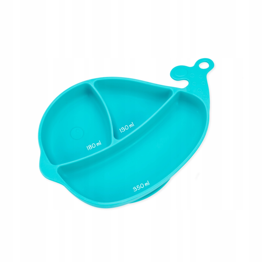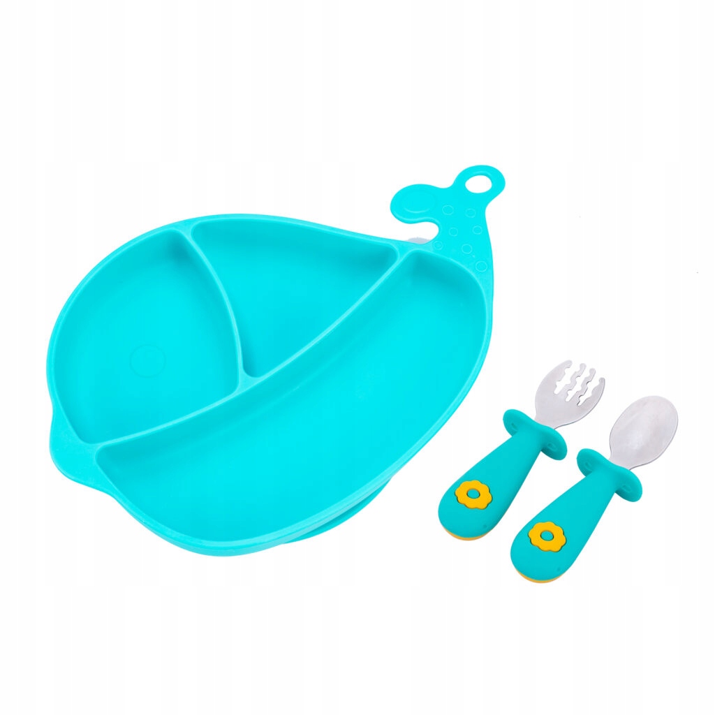 Включає силіконову тарілку у формі кита та набір столових приборів (вилка та ложка)з нержавіючої сталі та силікону. Кожне відділення тарілки має різну місткість, що дозволяє правильно розташувати окремі елементи страви. В основі тарілки є силіконова присоска, яка запобігає зміщенню тарілки, що полегшує вашій дитині їсти їжу. Столові прибори оснащені силіконовими ручками, які запобігають безконтрольному вислизанню ложки або виделки з ручки.