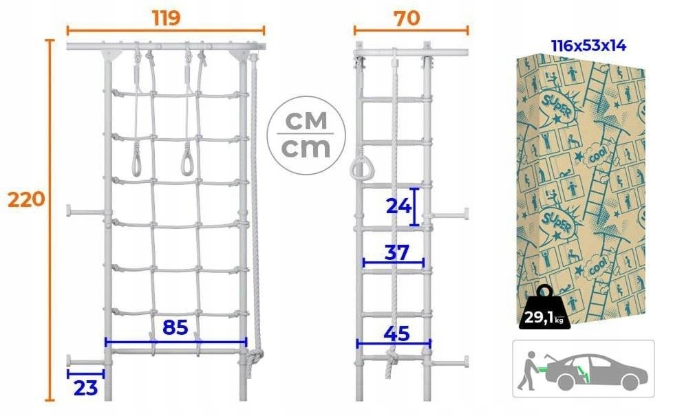 гімнастична драбина Сучасний спортивний набір із струнною сіткою дозволяє оптимально використовувати простір у квартирі. Наступні 4 дитячі сходи допомагають практикувати силу руки з горизонтальною драбиною. У дитячому ігровому комплекті є оригінальний дизайн та макет елементів. Ви можете повісити різні спортивні аксесуари на горизонтальній драбині. У наборі мотузка, акробатичні колеса та сітка шириною 70 см, виготовлена з сильної мотузки. Конструкція витримує навантаження 100 кг. Наступні 4 гімнастичні сходи можуть бути встановлені в дзеркальному відбитті, а це означає, що ми встановлюємо сітку з будь -якої сторони гімнастичної драбини і встановлюємо стільки, скільки нам підходять.