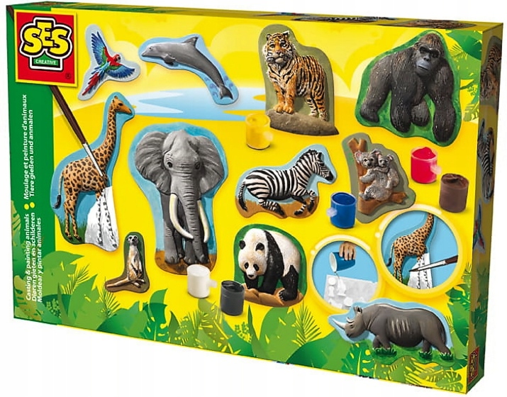 За допомогою цього гіпсового набору від SES ви можете зробити 11 тварин. Приготуйте гіпс, розлийте його по формах, дайте йому висохнути і розфарбуйте тварин, як хочете. Ви можете створити свій власний зоопарк: слон, дельфін, зебра, тигр, горила, папуга-бегемот, панда, коала, жираф і сурикат. Гра дуже весела і закінчується чудовими результатами!