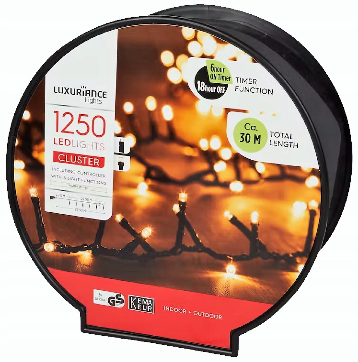 З 1250 вогнями, розподіленими по довжині приблизно 30 метрів, ви можете легко заповнити будь-яке дерево. А може, ви віддаєте перевагу прикрасити весь паркан красивими вогнями? Виглядає дуже атмосферно. Тепле біле світло має 8 різних функцій. Від мерехтіння до блимання: ви вирішуєте, яка функція найкраще відповідає вашому настрою. Взимку швидко темніє. Завдяки цьому ви можете легко встановити таймер і вам буде затишно, коли ви повернетеся додому. Натисніть і утримуйте кнопку приблизно 2 секунди, поки вона не стане зеленою. З цього моменту світло вмикатиметься на 6 годин і вимикатиметься на 18 годин. Це неймовірно зручно. Щоб вимкнути таймер, знову натисніть ту саму кнопку та утримуйте її 2 секунди. Новорічна ілюмінація має знак якості KEMA-KEUR і відповідає вимогам безпеки, зазначеним у нормативних документах.
