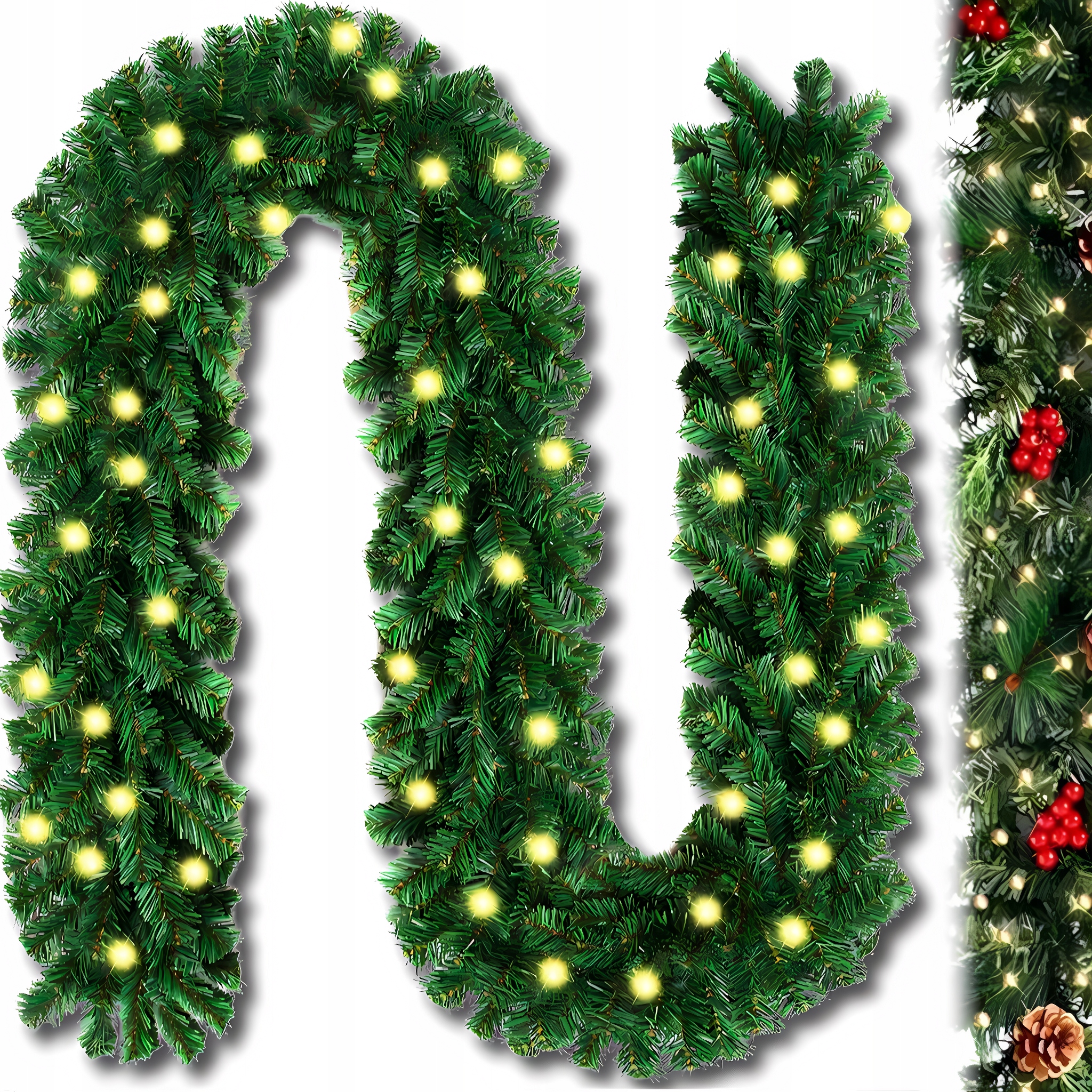 Виготовлена з високоякісного ПВХ, ідеально імітує натуральні ялинові гілки. Вона гнучка, тому ви можете вільно її формувати та адаптувати до вибраного простору - ідеально підходить для декорування камінів, поручнів, двері, вікна чи вітрини. Ви також можете додатково прикрасити його фенечками, бантами чи сосновими шишками.