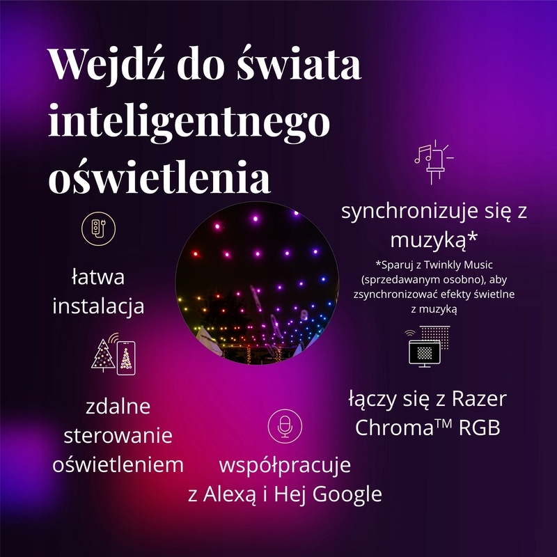 Twinkly light fest виділяється своєю інтеграцією розумного дому з Apple HomeKit, Google Assistant і Alexa від Amazon. Пристрої Twinkly можна синхронізувати – загалом до 4000 точок світла або 10 пристроїв (з хорошим покриттям Wi-Fi) – для ефектного декору.
