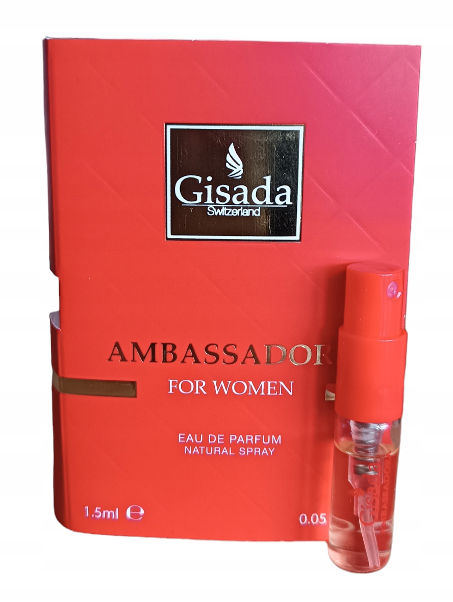 Ambassadora від Gisada - парфуми для жінок і чоловіків. Амбассадора вийшов у 2021 році. Верхні ноти: Рожевий Перець, Мандарин, Чорниця і Лист Фіалки; ноти серця: Апельсиновий Цвіт, Кашемірове Дерево, Жасмин і Фрезія; ноти бази: Ваніль, Цукор, Ветивер, Мускус і Сандал.