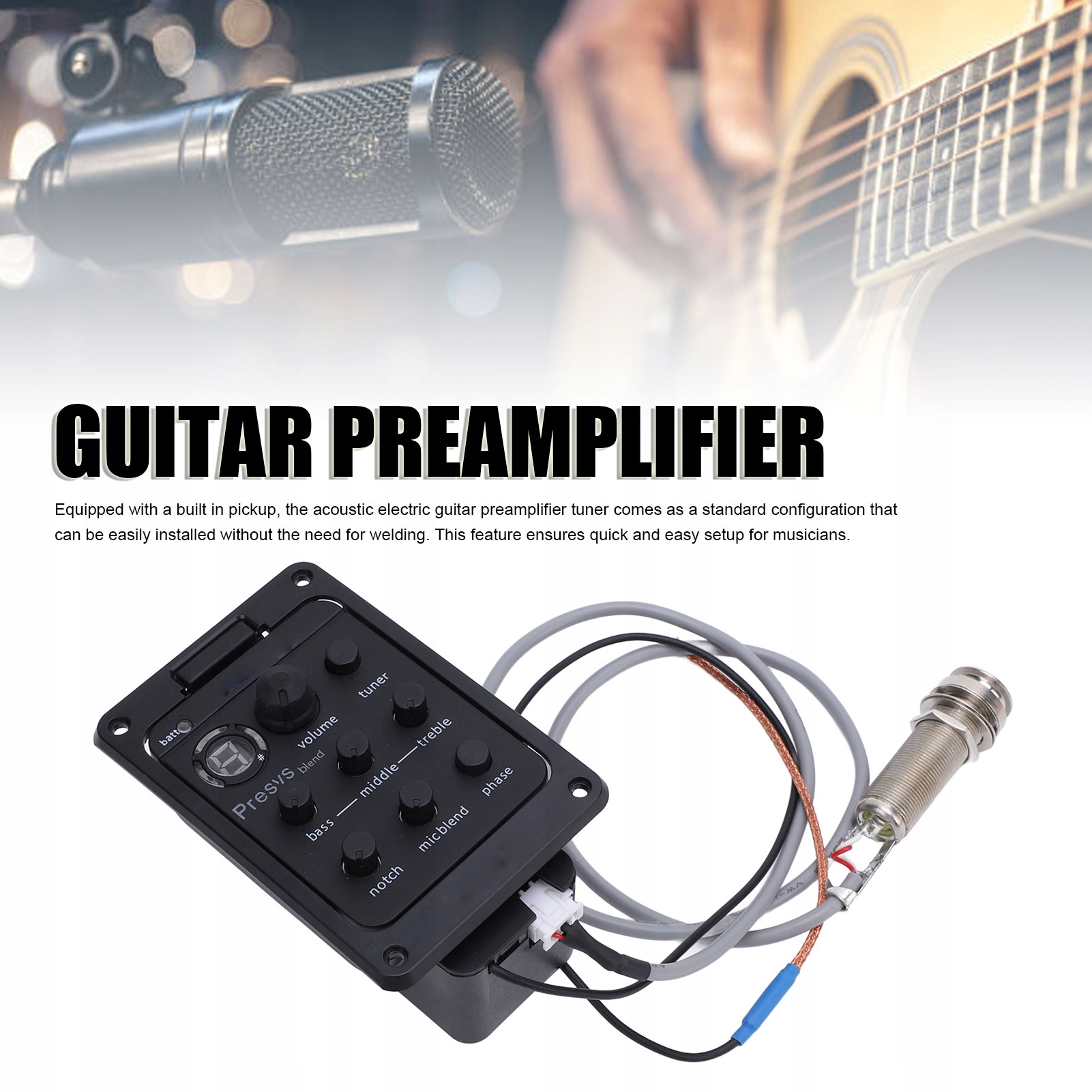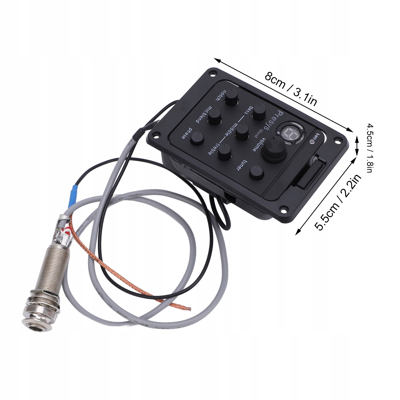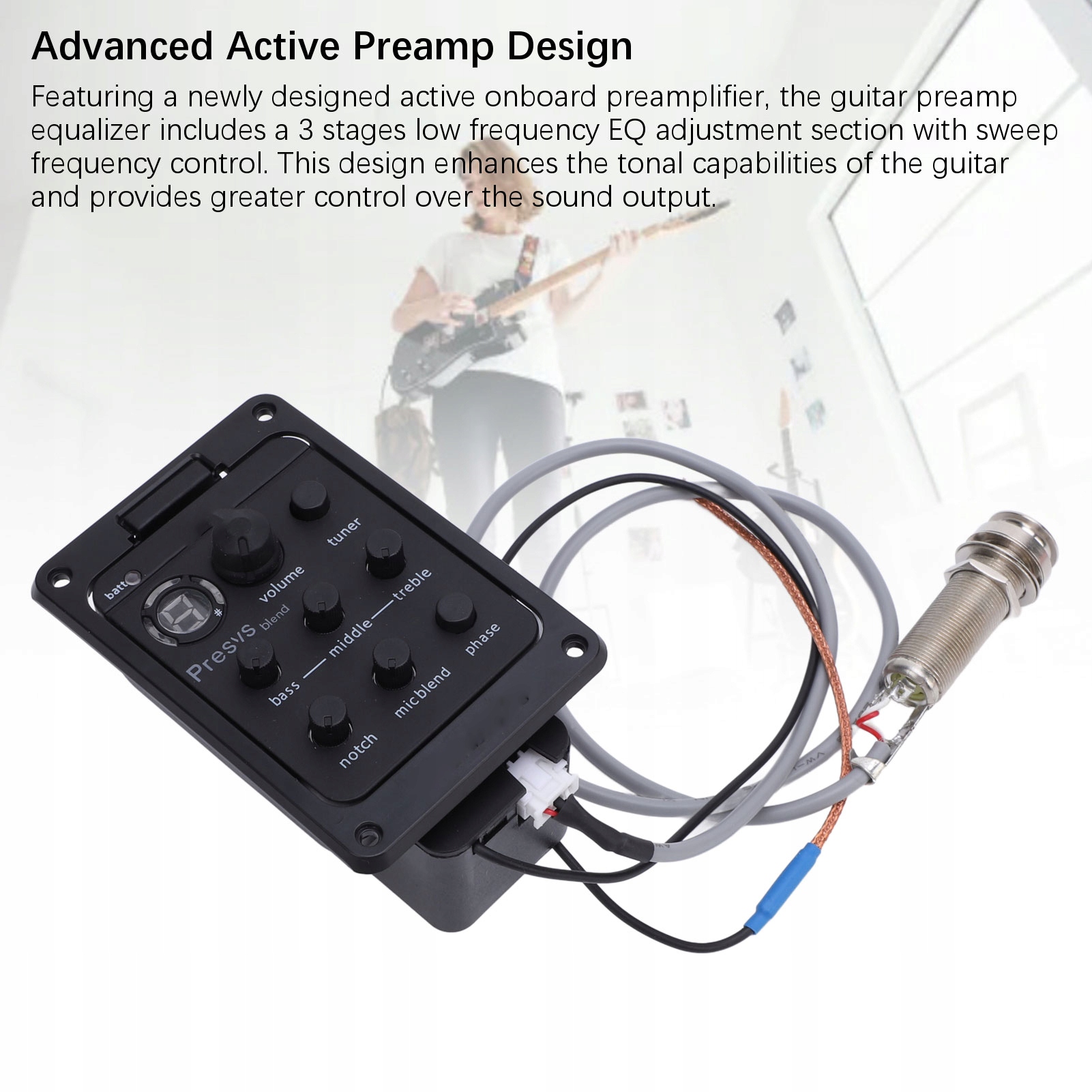 2. Універсальний контроль звуку: Equiser для акустичної гітари пропонує комплексні функції керування звуком, включаючи регулятори гучності, баса, середньої та висоти тону, контроль яскравості, режекторний фільтр і перемикач фази. Ці елементи керування дозволяють музикантам точно налаштовувати звук відповідно до своїх уподобань.