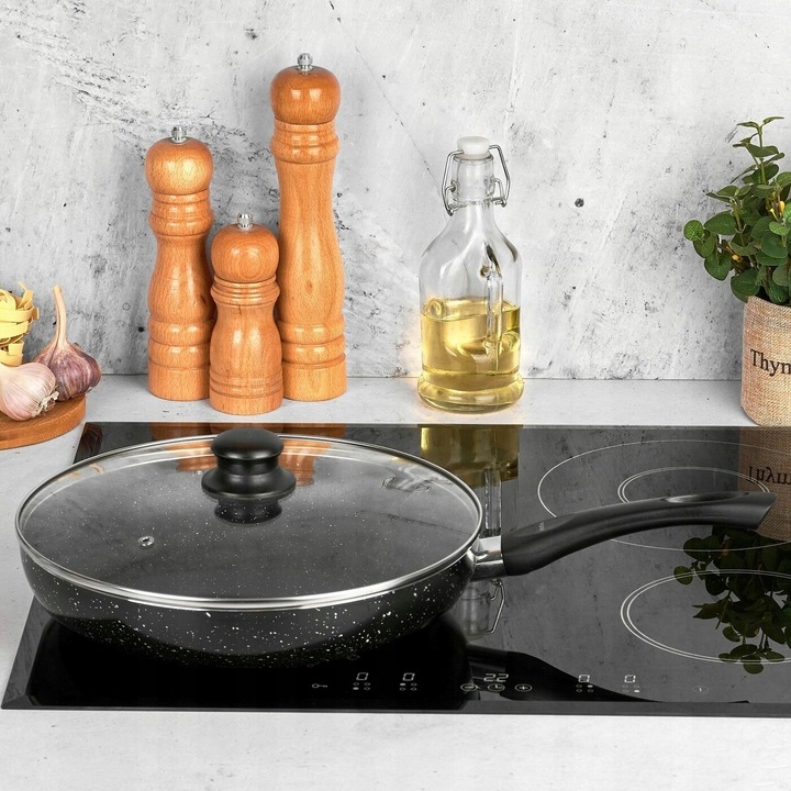 Інша інформація: - алюмінієва сковорода з антипригарним покриттям, крапчаста, - пластикова ручка з отвором для підвішування, - висота краю: 5 см, - скляна кришка зі сталевим краєм і вентиляційним отвором, - прикручена ручка кришки