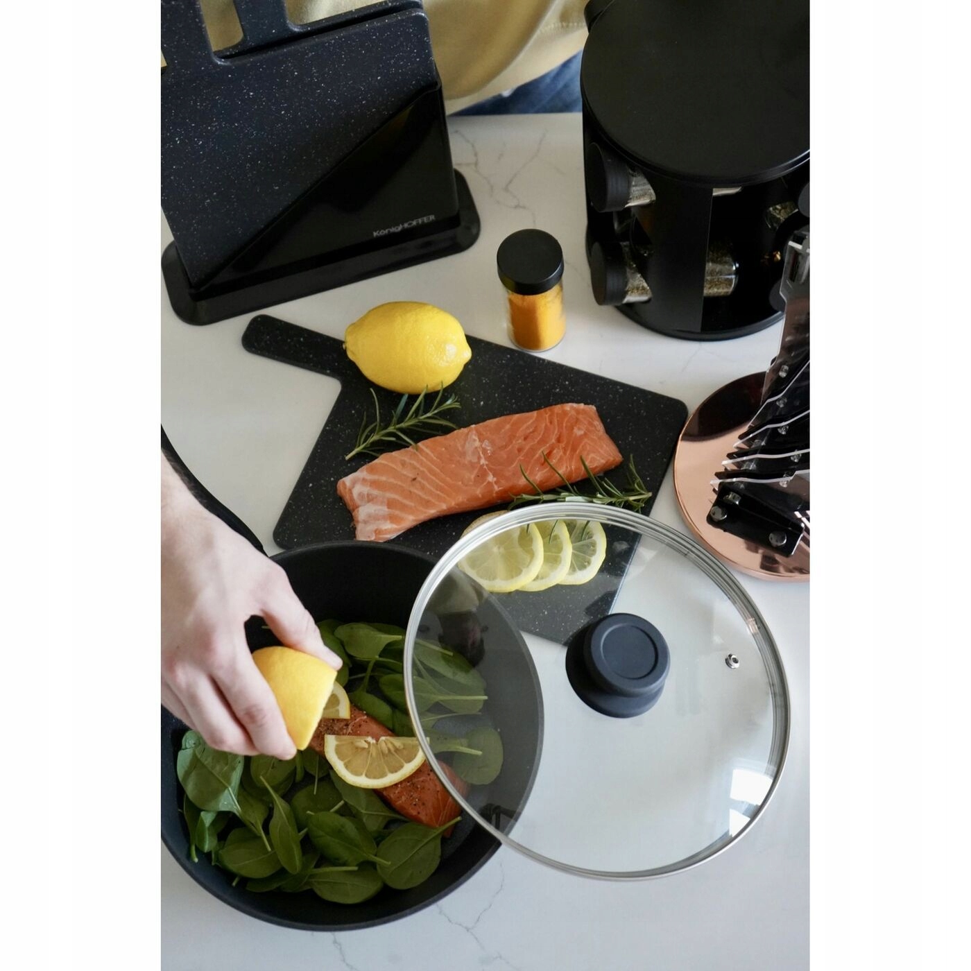 Глибоку антипригарну сковороду Konighoffer Corvos 28 х 7,5 см можна використовувати на індукційних, газових, керамічних та електричних плитах. Його алюмінієвий корпус гаряче кований. Завдяки цьому він добре збалансований, важкий і має міцні стінки. Він також має набагато вищу стійкість до високих температур і пошкоджень. Антипригарне покриття AEROLITE (товщина 50-65 мікрометрів) було спеціально збагачене та не містить PFOA. Він також міцніший, ніж стандартні 2-шарові покриття, щоб запобігти прилипанню та підгорянню інгредієнтів. Його довговічність досягає 50 000 циклів стирання - один з найкращих результатів у світі. На сковороді Corvos ви можете смажити все, що завгодно, з невеликою кількістю вершкового або оливкового масла. Ви також можете тушкувати інгредієнти, тому що в набір входить спеціальна скляна кришка з металевим краєм і ефективним паровим отвором. Ви можете зручно змішувати інгредієнти і прати виріб. Сучасний дизайн зі смаком збагатить вашу кухню - це простий шлях до комфорту створення дієтичних і легкозасвоюваних страв. Ручки Soft Touch (каструля і кришка!) покриті шаром силікону і мають нековзку поверхню. Їх конструкція не нагрівається і забезпечує хороший захист від опіків. Продукт рекомендований Ewa Wachowicz. Як амбасадор бренду Konighoffer, вона тепло та з усмішкою рекомендує його для домашнього використання. Разом з ним ви отримаєте свій рецепт для дому. Це один з найкращих варіантів у цій категорії!