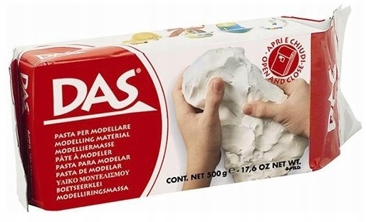 Глина за ліплення самозатвердіюча (не потрібно випікати). Час висихання 24 години на 1 см. Легко формувати. Його можна використовувати з деревом, картоном або теракотою. Для оздоблення готової скульптури можна використовувати фарби і лак. Предмети з глини Das міцні та довговічні.