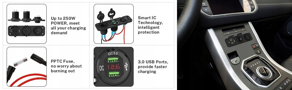 - 1 × USB QC 3.0 гніздо для зарядки + 1 × гніздо для прикурювача + 1 × перемикач + 1 × база диска