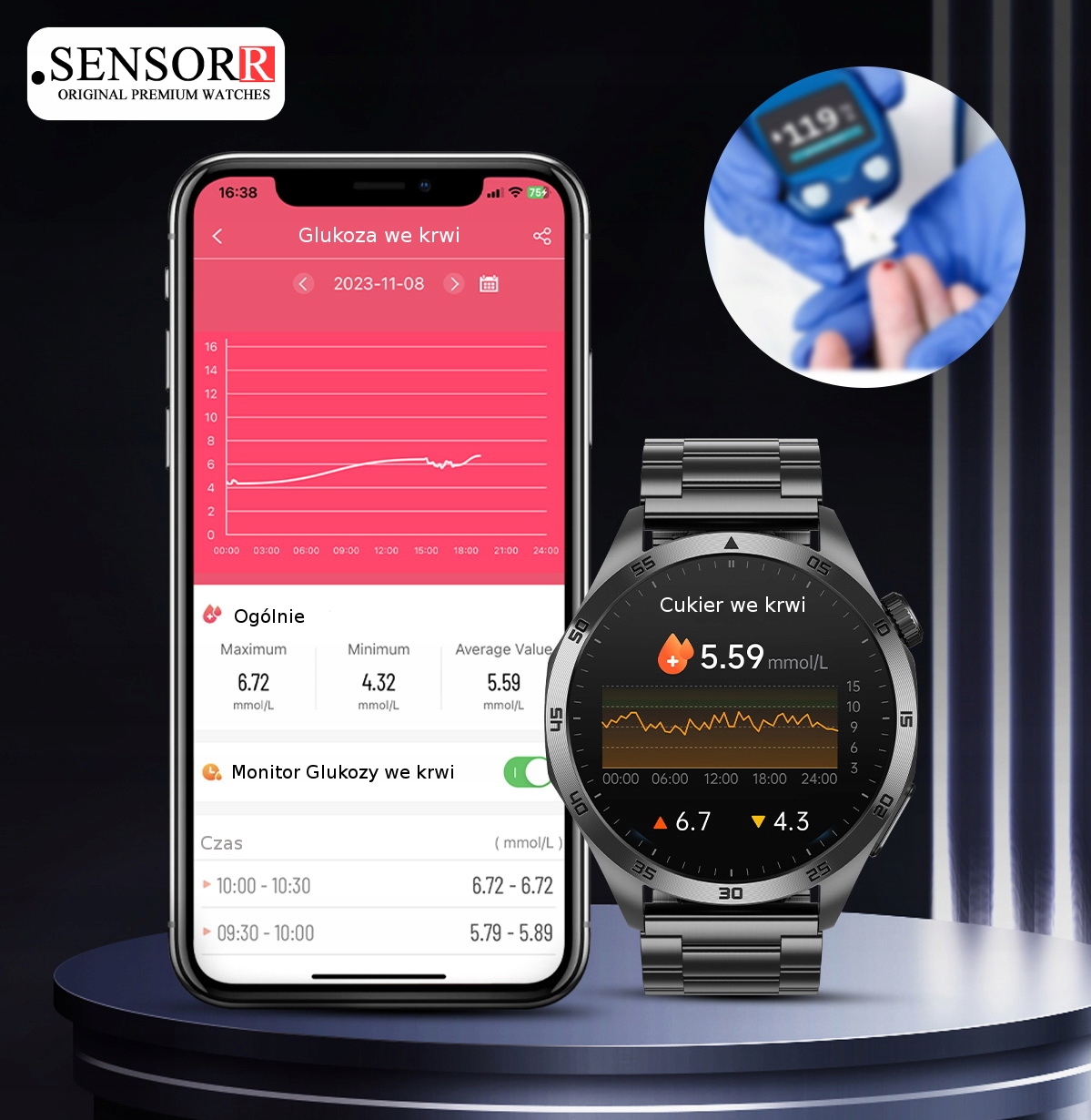 Функція вимірювання глюкози дозволяє перевірити поточний рівень цукру в крові. Дані відображаються безпосередньо на екрані годинника або в додатку, включаючи детальні дані.