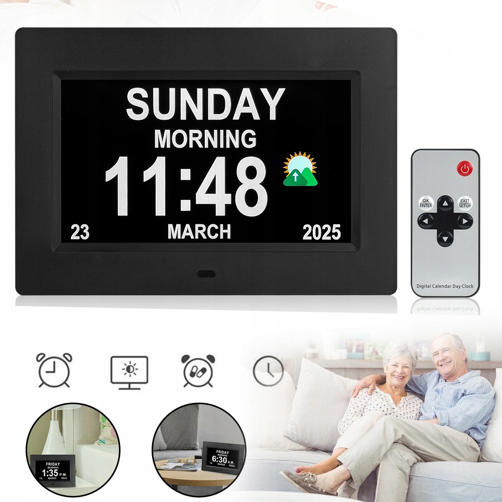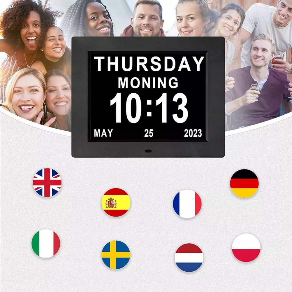 Цей календарний годинник інформує про час протягом дня, що робить його корисним годинником для літніх людей, щоб бути незалежними та відновити свою гідність. Корисна допомога для людей із вадами зору: великий цифровий годинник чітко показує час і дату. Упаковка не містить тексту про втрату пам’яті, деменцію чи хворобу Альцгеймера і є ідеальним подарунком для літніх людей.