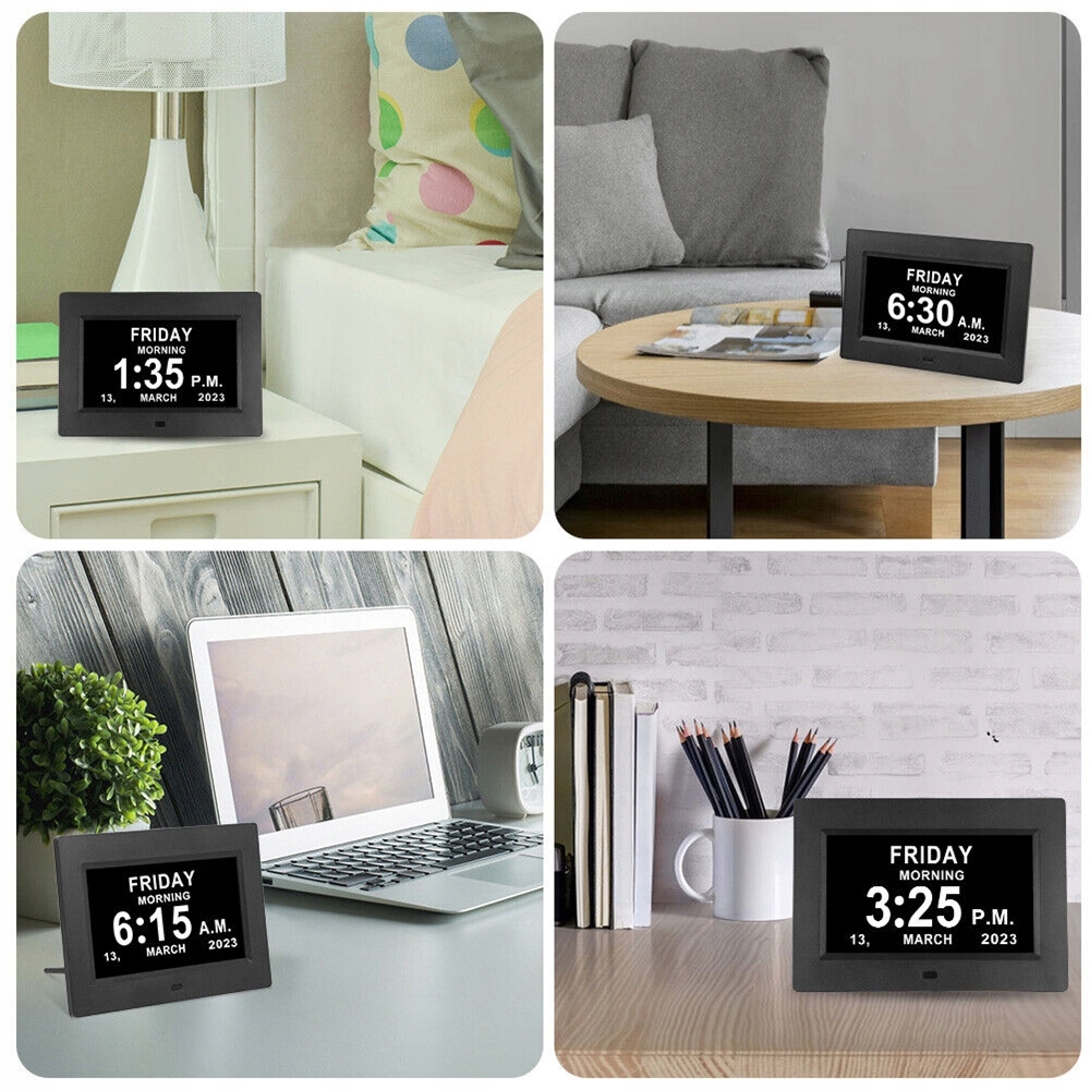 7-дюймовий HD LCD-дисплей годинника чітко показує весь день тижня, місяць і дату великими жирними літерами. Без заплутаних скорочень! Кольори антивідблиску: білий, жовтий, червоний і синій для захисту. Налаштуйте свої очі та підберіть їх до свого кольору. Легко читається літніми людьми з вадами зору або кольоровим зором.
