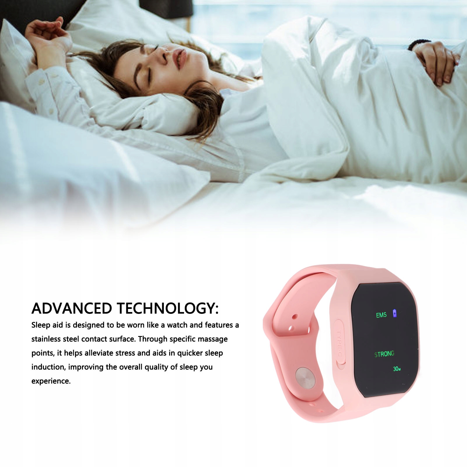 1. Удосконалена технологія: снодійний призначений для носіння як годинник і має контактну поверхню з нержавіючої сталі. За допомогою спеціальних точок масажу він допомагає зняти стрес і швидше заснути, покращуючи загальну якість сну.