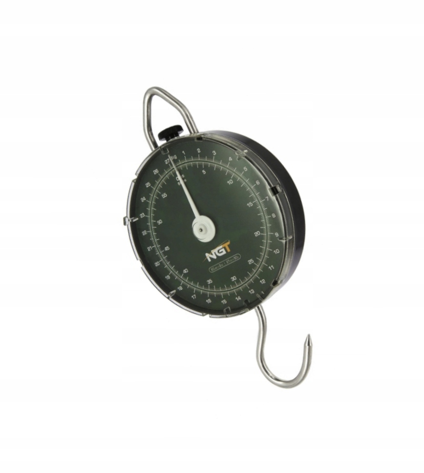 Шкала годинника 27 кг ngt була виготовлена з сильного пластику, як корпусу, так і окуляра. Завдяки своїй простоті, дуже популярній серед Карпат. Біла шкала ідеально помітна в будь -яких умовах. Сильний і надійний гачок використовується для призупинення риби у ваговій мішці. Виробник не прийняв функцію тертя для того, що призначена ручка.