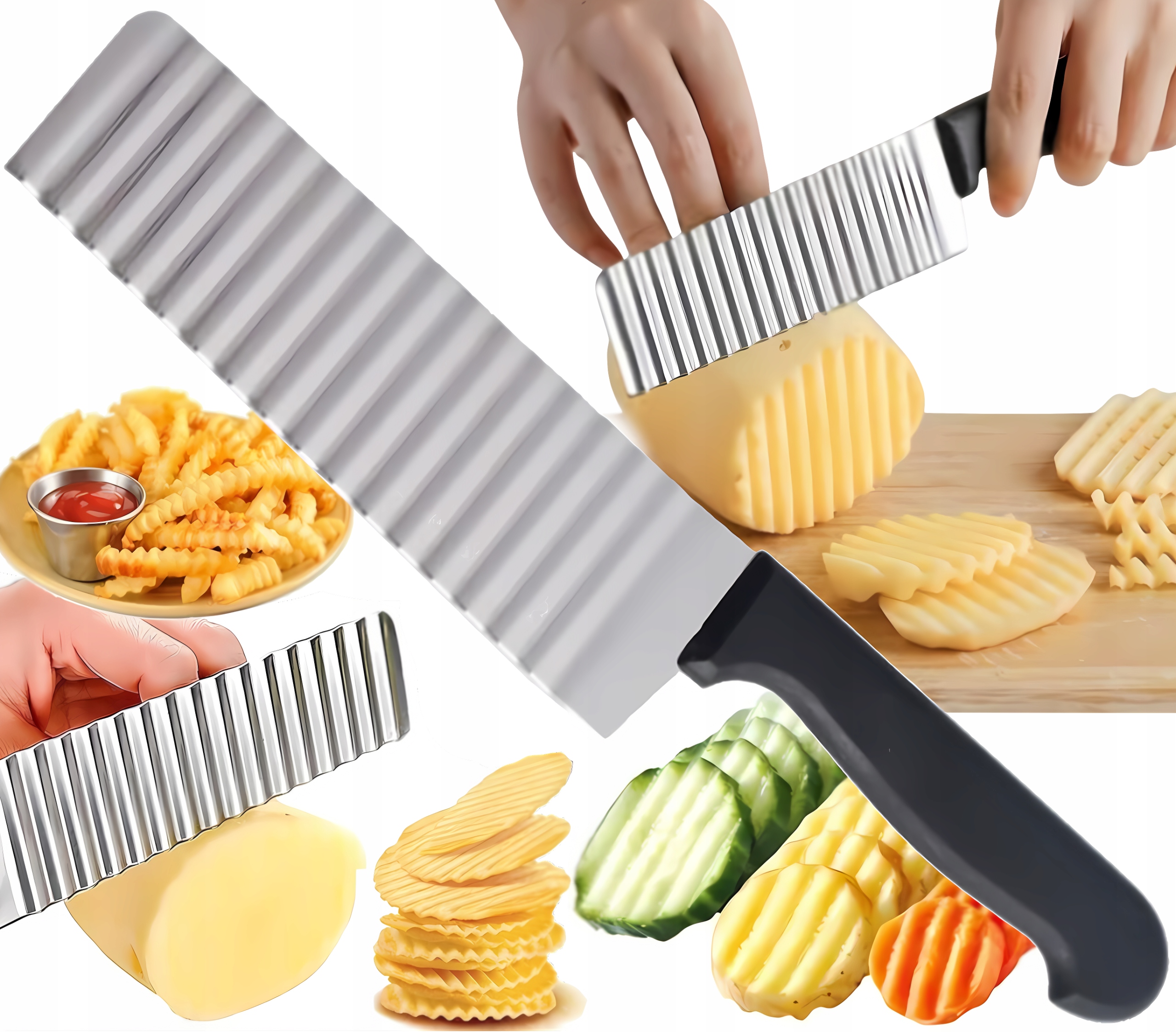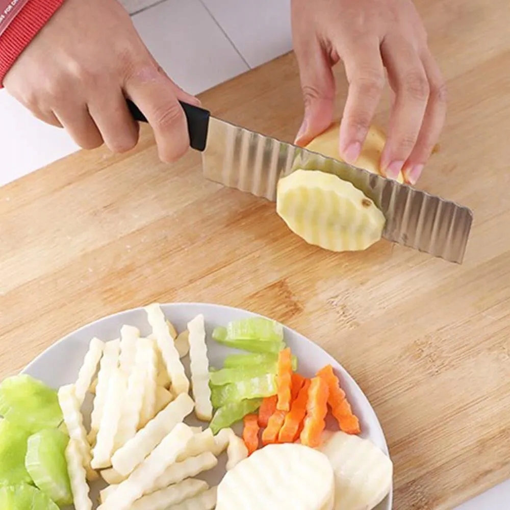 Гофрований ніж для нарізки картоплі фрі, овочів і фруктів – практичний кухонний аксесуар, який дозволяє легко надати стравам привабливий вигляд. Завдяки спеціально розробленому лезу ви можете отримати характерну хвилясту форму скибочок, ідеальну для картоплі фрі, чіпсів, овочів або декоративних закусок.