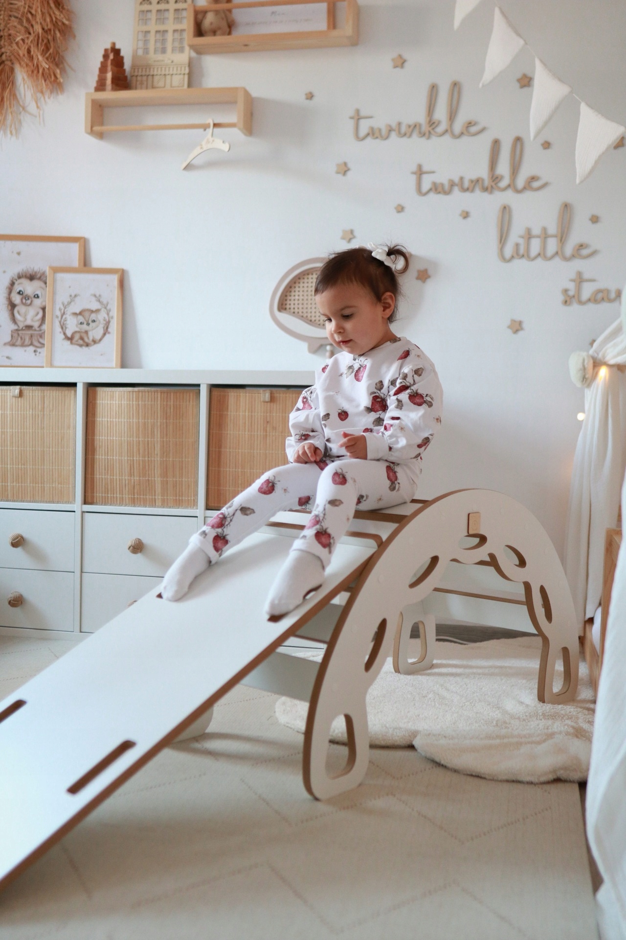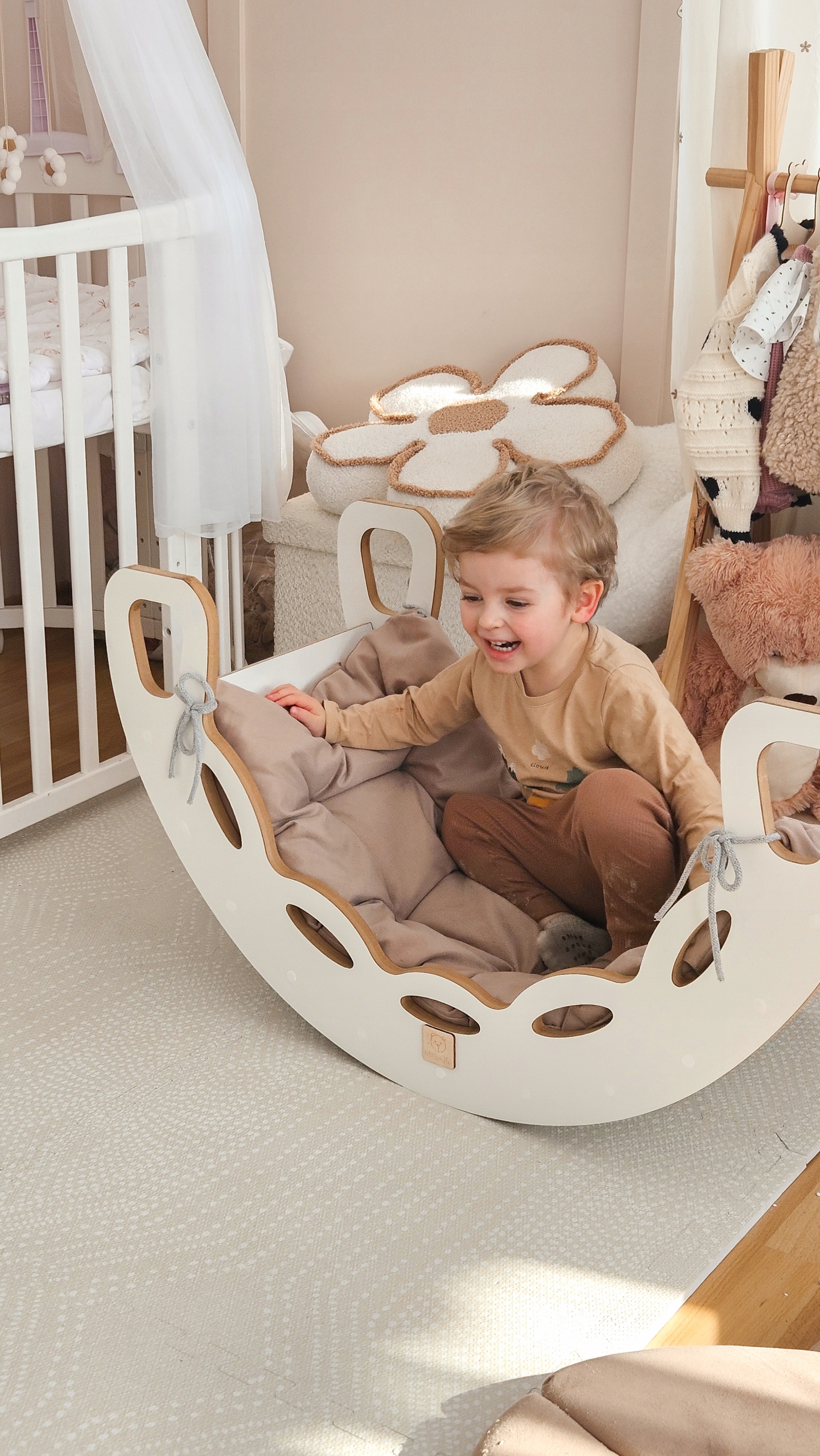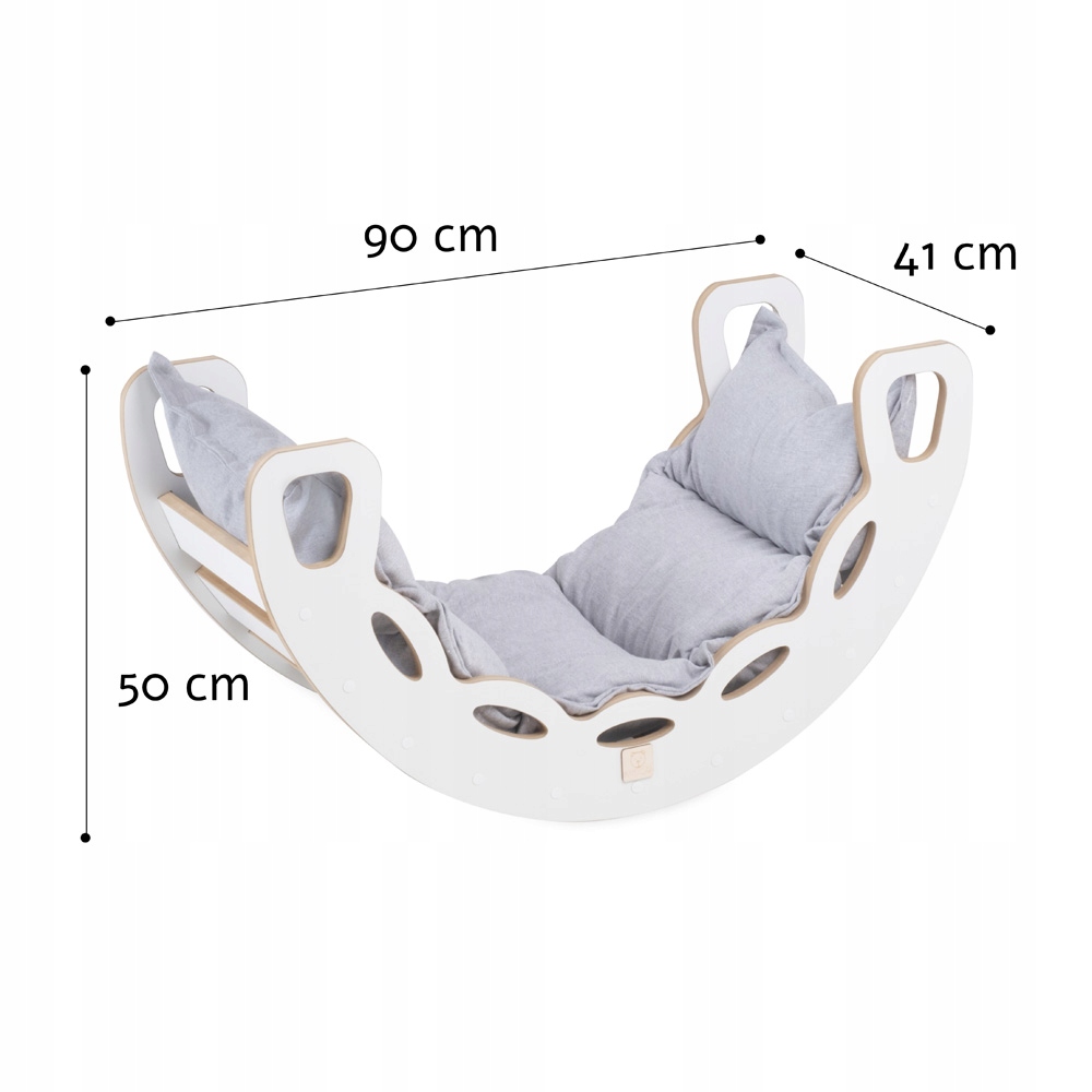 MiSioo Bujak Small Rocker 4 IN 1 + Clizebing Stall/Slide + Яскрава сіра подушка, біла дерев'яна гра