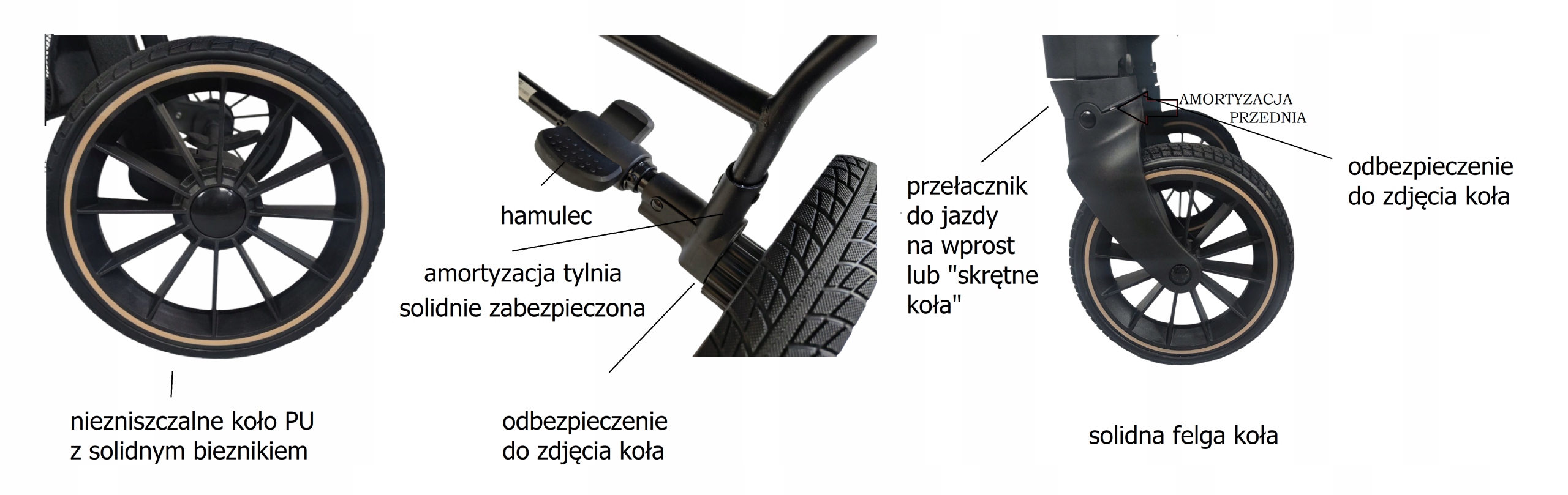 Покришки з ПУ - це найкращий матеріал, який використовується для виробництва шин в колесах дитячих колясок. Він легкий і стійкий до стирання. Колеса захищені протектором, що значно полегшує пересування по піщаній або мокрій поверхні. Завдяки своїм властивостям вони практично не піддаються руйнуванню при стандартному використанні. Характеристики матеріалу означають, що він не твердне взимку і не розм'якшується влітку. Амортизація дуже схожа на амортизацію надувного колеса, що означає, що ви не будете скаржитися на комфорт. Поліуретанові колеса не застряють у каменях і надзвичайно стійкі до механічних пошкоджень.