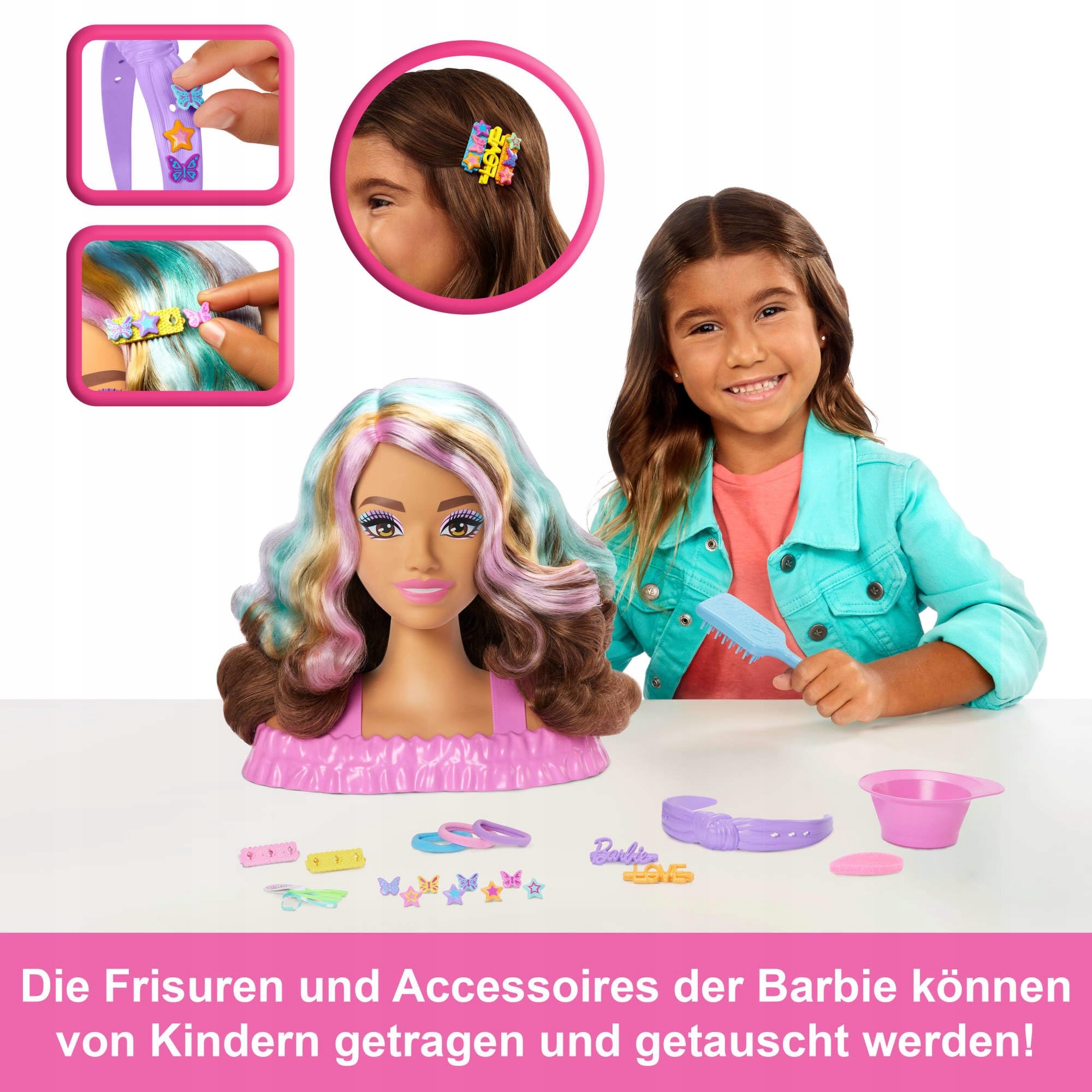 Барбі – голова для укладки ляльки, темно-каштанове волосся з понад 20 аксесуарами для укладки, включаючи зірочку, метелика та заколки для волосся, що змінюють колір, JFG82