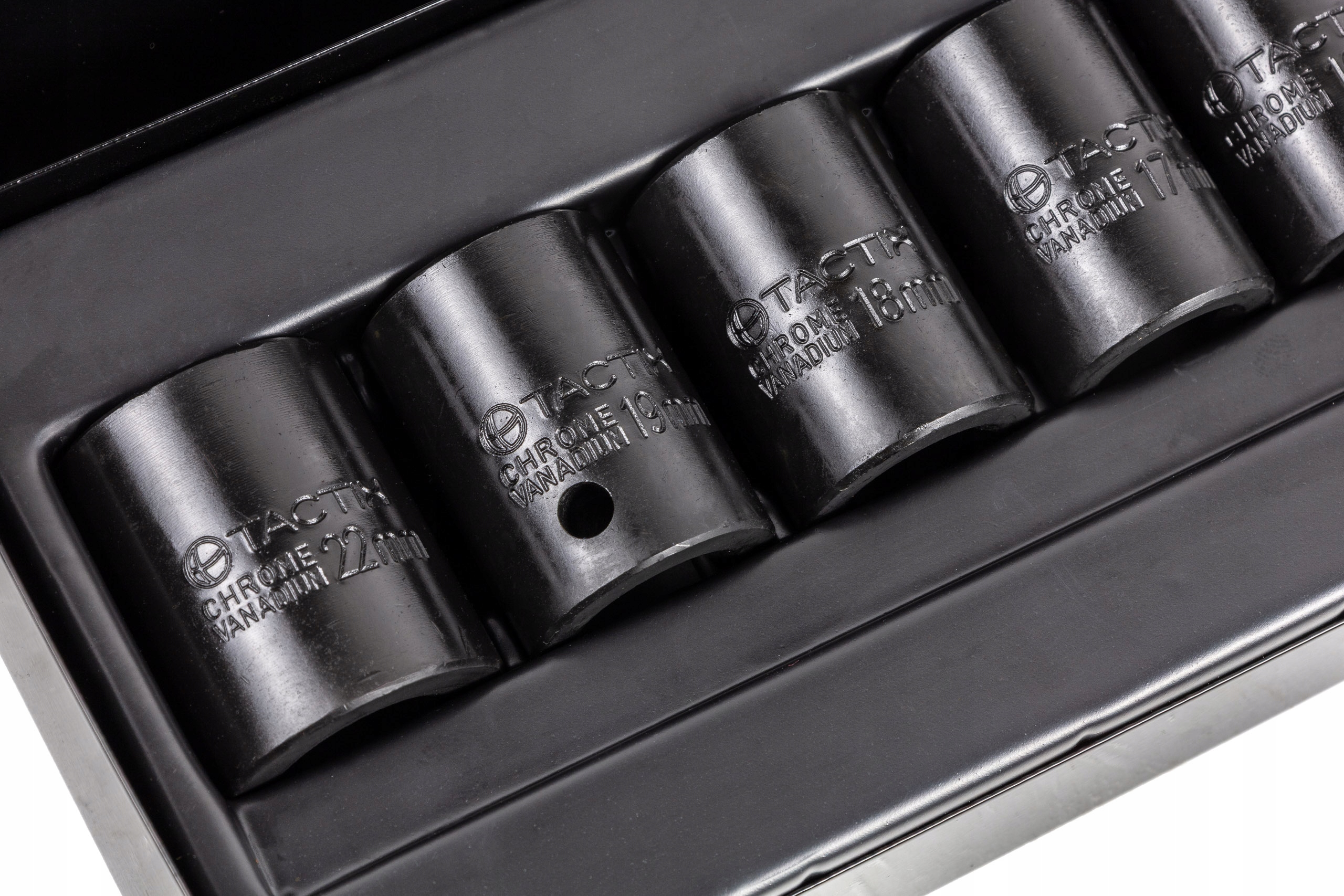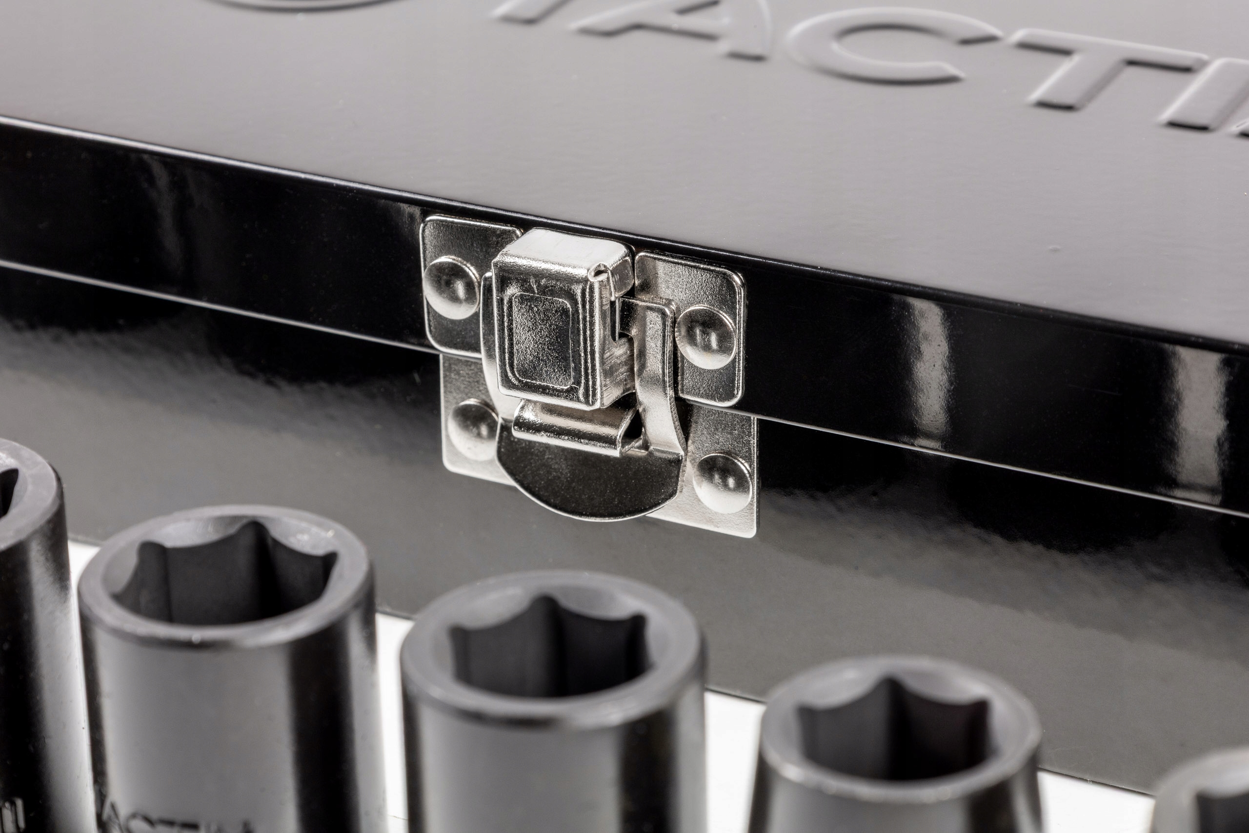 Гільзи призначені для роботи з ударними гайковими ключами 1/2". Розміри: 10, 12, 13, 14, 15, 16, 17, 18, 19, 22 мм. Кожна головка виготовлена із загартованої сталі з чорним покриттям, яке підвищує стійкість до корозії та покращує зовнішній вигляд інструментів. Все це упаковано в елегантну, міцну чорну металеву коробку, яка захищає розетки та полегшує їх зберігання. стійкість до корозії, естетичний зовнішній вигляд